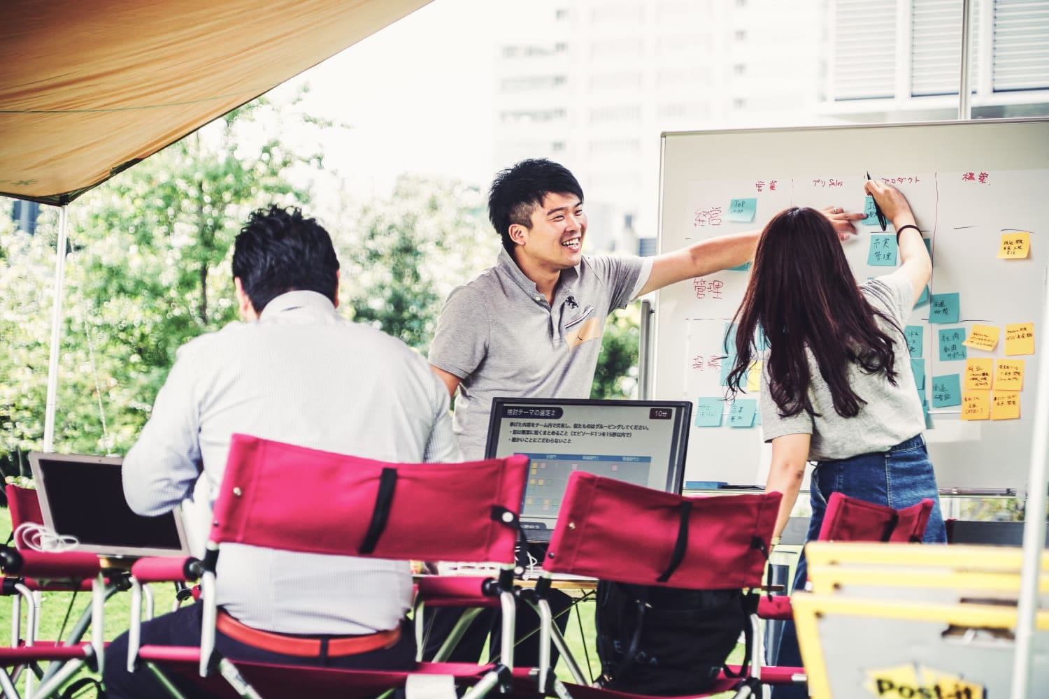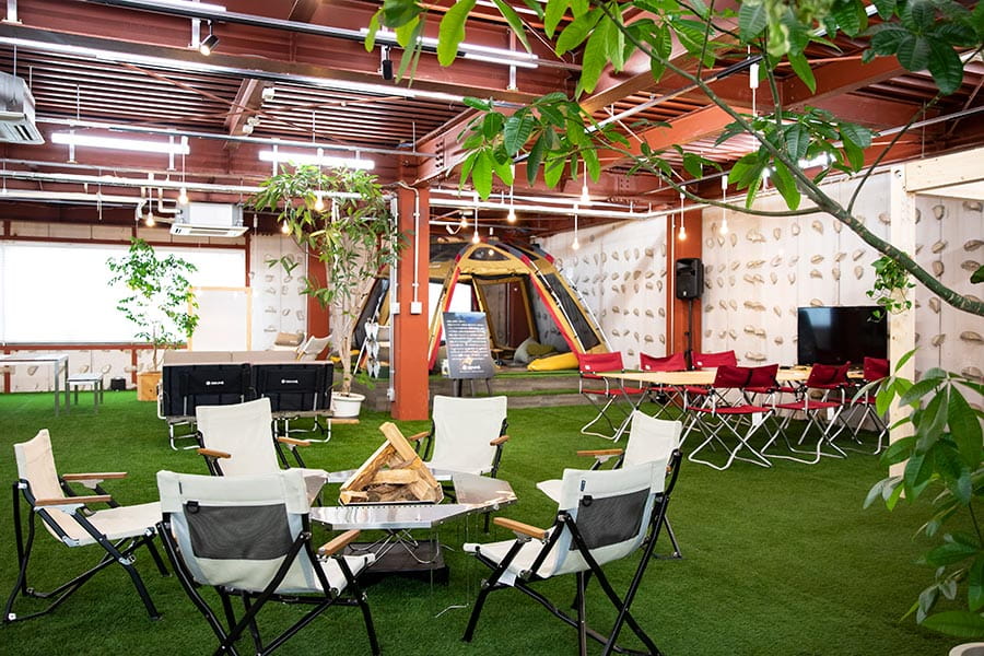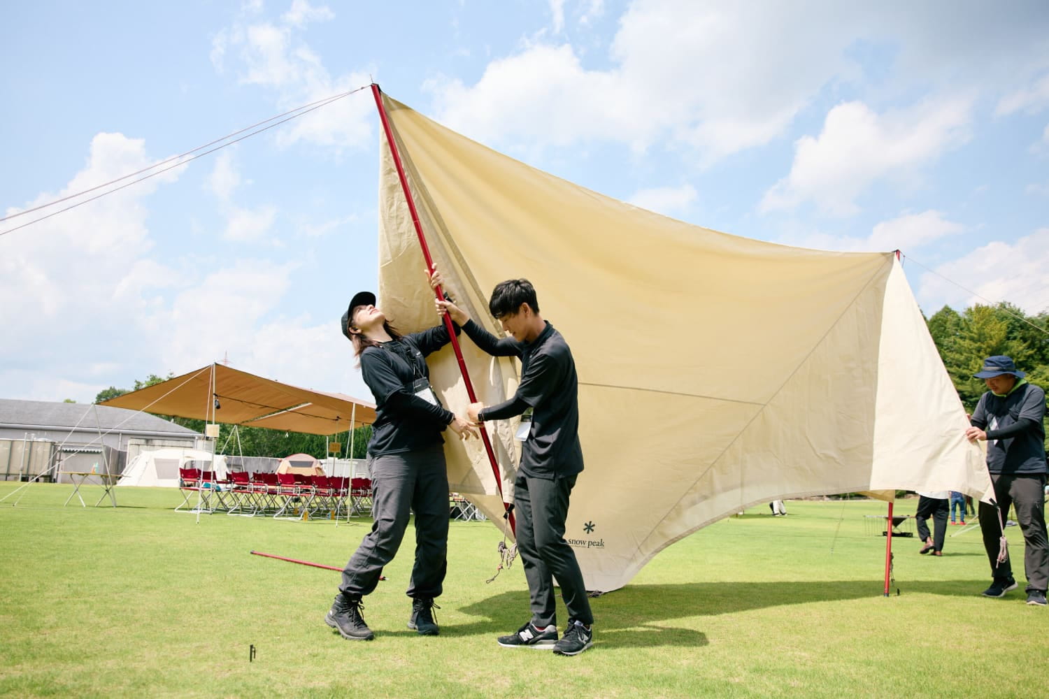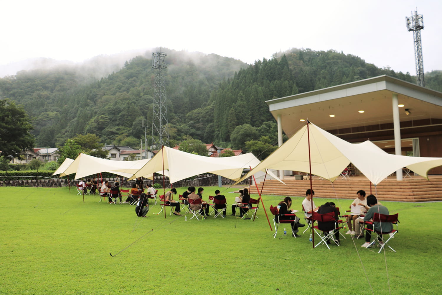 テント、タープ、焚火台など、自然と人、人と人をつなぐスノーピークのキャンプギアをビジネスに取り入れ、クリエイティブな発想や円滑なコミュニケーションを生み出すサービス。大自然から都心部の緑地、オフィスの中まで様々な空間にキャンプシーンを感じられるワークプレイスを提供しながら、導入コンサルティングやファシリテーション、研修までもサポートしています。