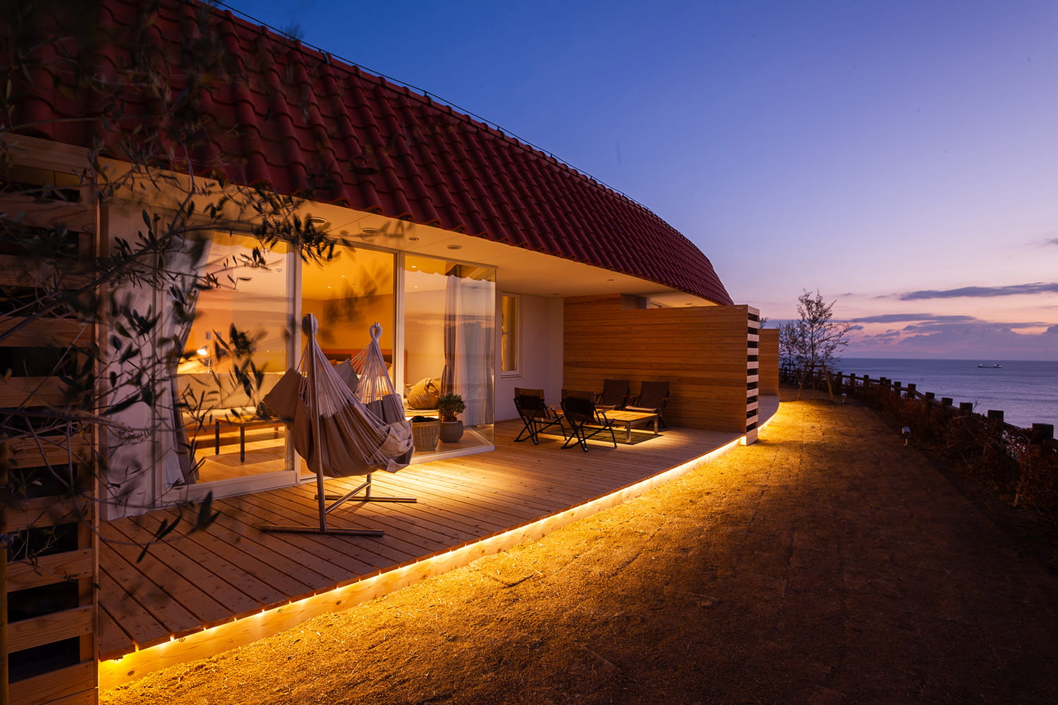 スノーピーク初のホテル宿泊スタイルの体験型グランピング施設。スノーピーク製品でコーディネートされた客室は、全室オーシャンビューとなっており、リビングから屋外へとつながるスペースにはウッドデッキとガーデンを設け、BBQスタイルの食事やテラスでのスパ体験など雨天でも安心してお過ごしいただけます。