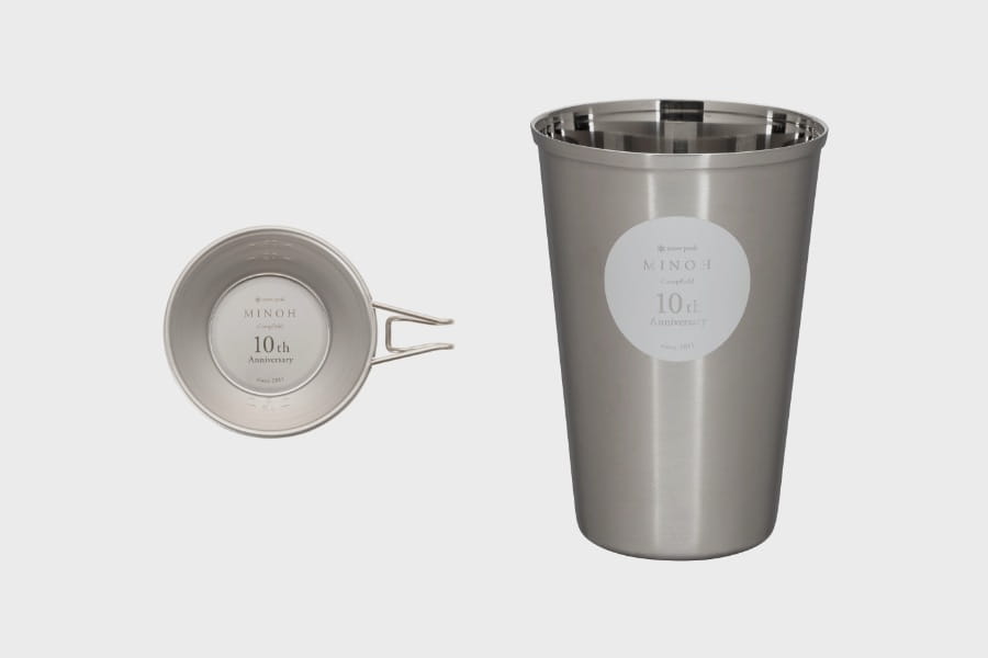 箕面キャンプフィールド10周年のロゴが印された特別なエコカップとミニシェラカップです。