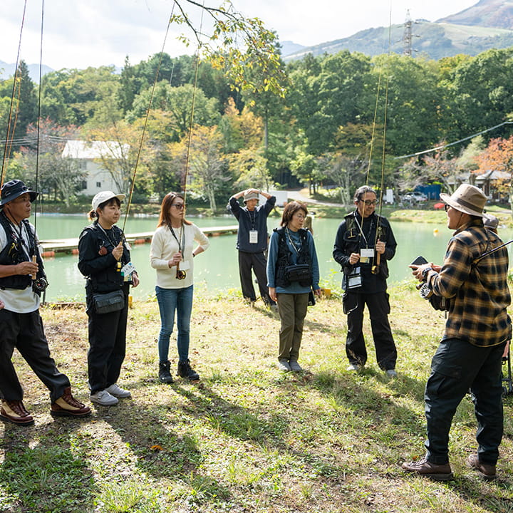 フィッシングに必要な道具は、すべてご用意いたします。会場は、初心者でも比較的チャレンジしやすい管理釣り場。基本的な道具の使い方や釣り方のポイントなど、初めの一歩から丁寧にレクチャーします。