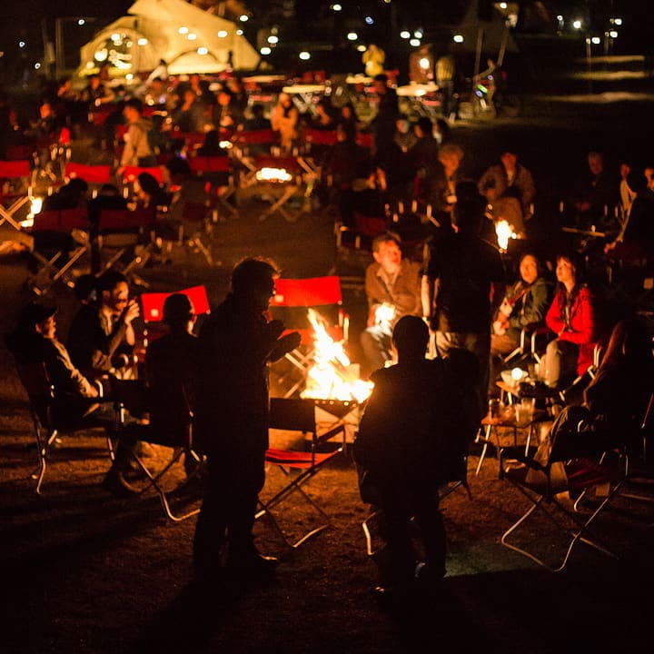 夜には、スノーピークスタッフやユーザーの皆さまとともに団らんのひとときを。野遊びの仲間として焚火を囲みながら、初めてのフライフィッシングの感想や気になることなどを自由に語り合いましょう。