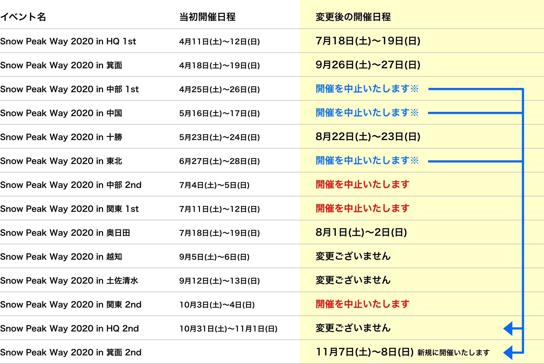 弊社では、新型コロナウイルス感染拡大防止にともなう政府・自治体の方針に従い、今年度開催を予定しておりました「Snow Peak Way 2020」「Snow Peak Way 2020 Premium」の全会場につきまして、開催日程を当初の予定から下記の通り、変更させていただきます。