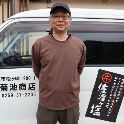 横浜生まれ松ヶ崎育ち。現在は、手作りで佐渡海洋深層水から作る塩や一夜干しイカなどの海産物を販売。本ツアーでは、菊池さんが営む製塩加工場をご案内していただきます。