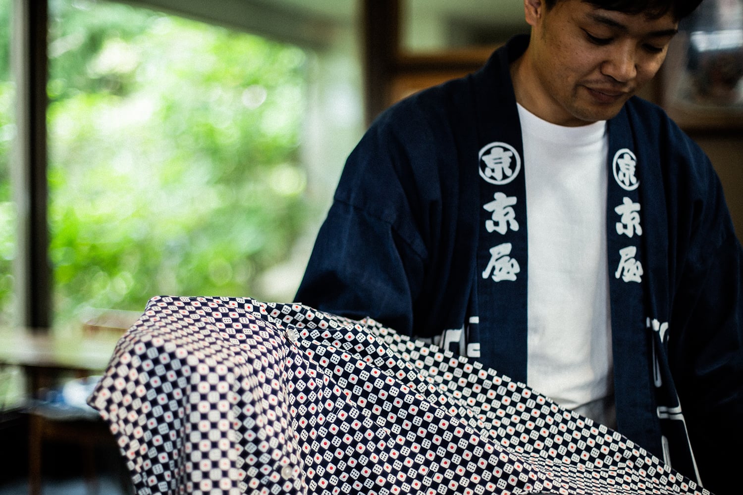 伝統的な仕立てが施されるまでの一連の職人の作業を、実際に工房で見学。さらにあなただけの名入れ手ぬぐいのデザイン、本格的な本染手捺染による染色を体験します。