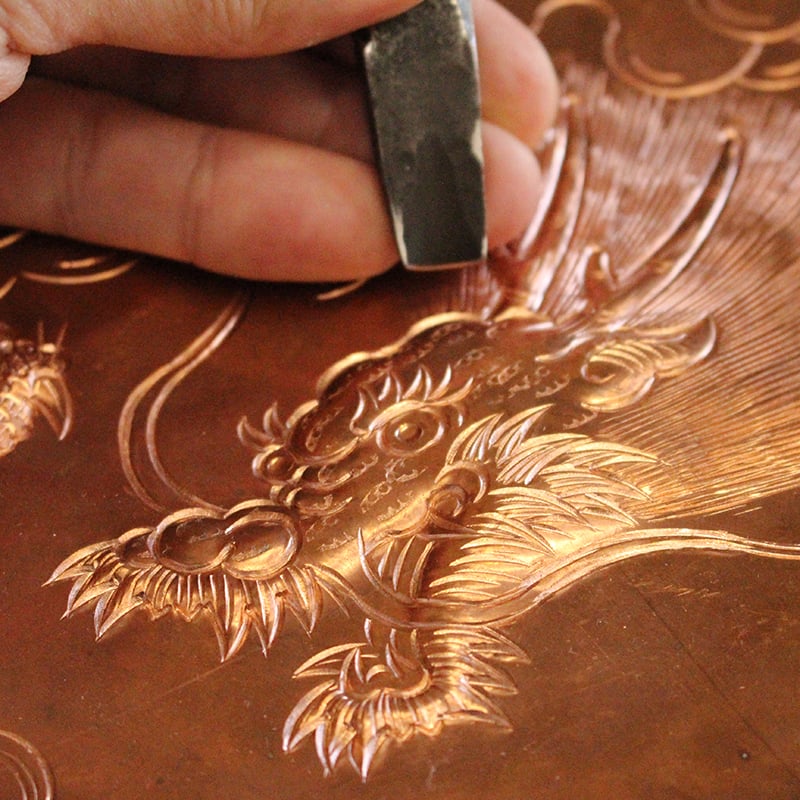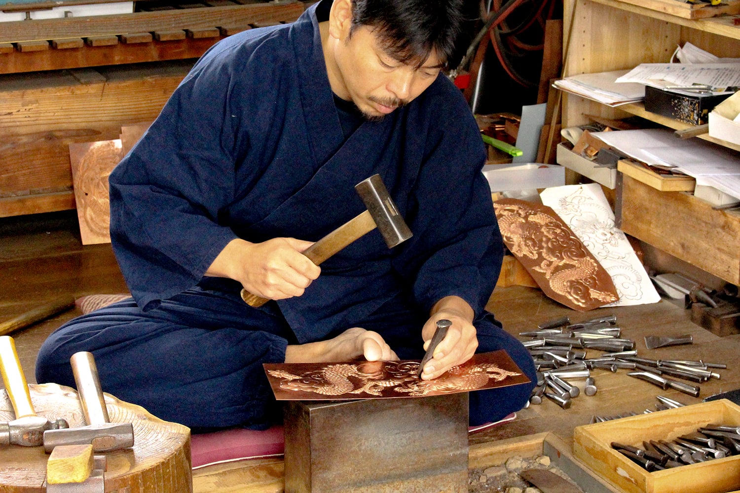 岩谷堂箪笥の大きな特徴の一つが飾り金具の美しさ。「彫金工芸 菊広」で、伝統的技法である手打ち彫りの様子を見学します。