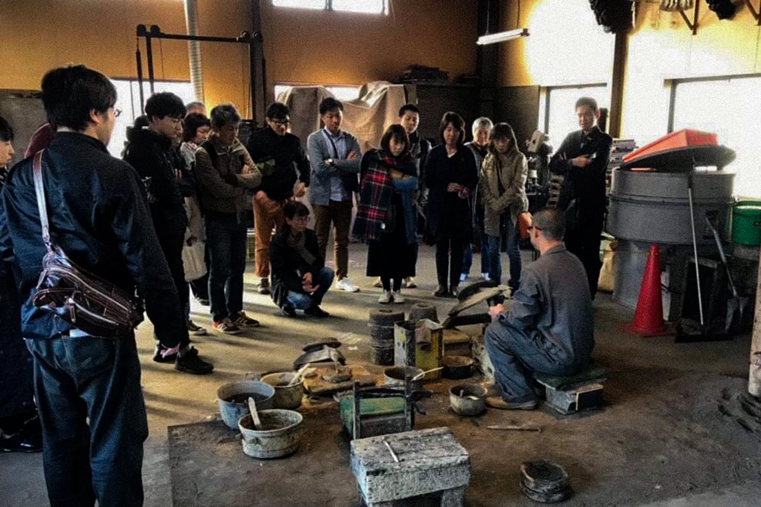 南部鉄器の鉄瓶を製造する「佐秋鋳造所」。古来より伝わる技法「焼型」でつくる様子を見学します。