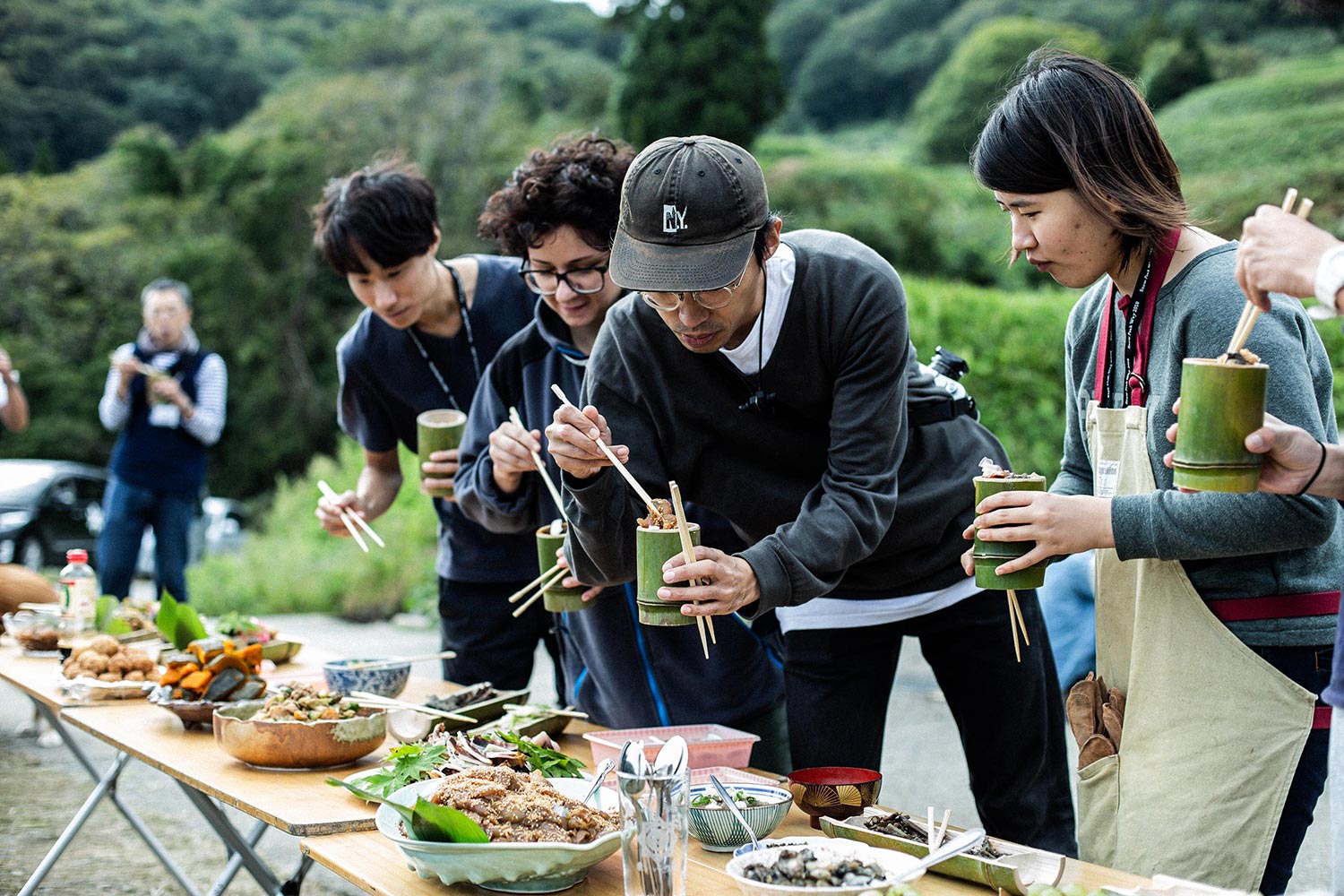 炊きたての棚田米や郷土料理を味わい、夜は神社でのテント泊。