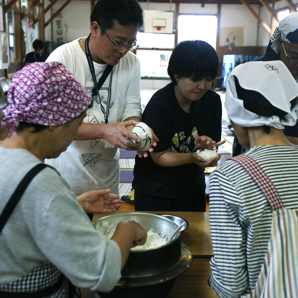 つややかな新米や郷土料理を味わい、夜は神社でのテント泊。
