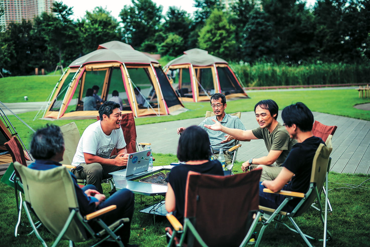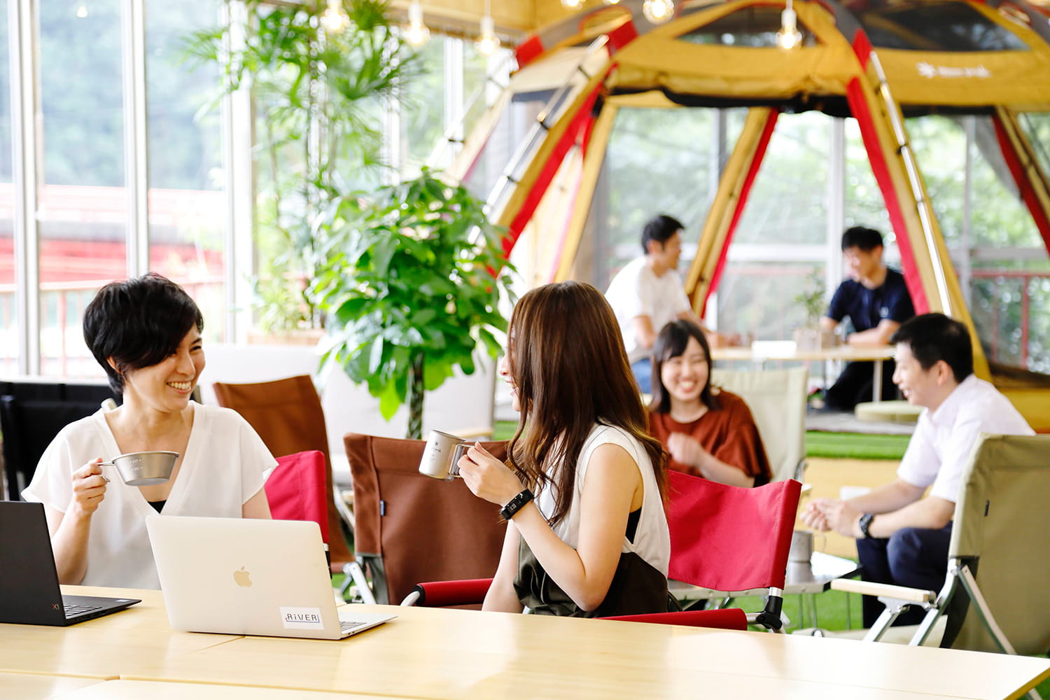 ビルの屋上や許可された公園で仕事をしたり、大自然が広がるキャンプフィールドの青空の下、テントやタープで会議をすると、いつもと違う視点やアイデアが生まれてきて、上司や部下といった立場を超えて、目的達成のために前向きで思い切った意見が飛び交う。