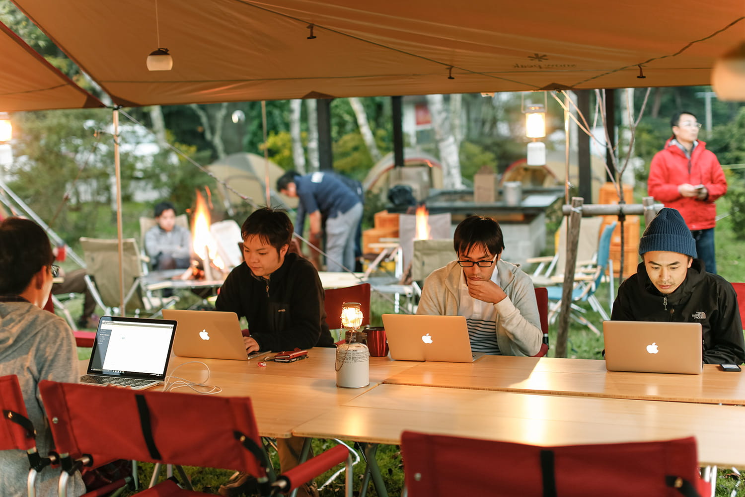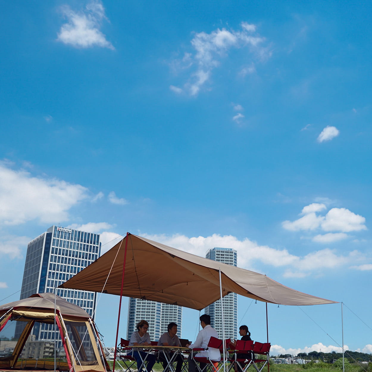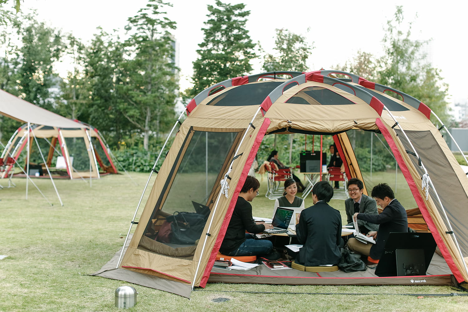 体験した人は、知っています。ビルの屋上や許可された公園で仕事をしたり、大自然が広がるキャンプフィールドの気持ちのいい青空の下、テントやタープで会議をすると、いつもの仕事に新鮮な感覚で向き合えたり、いつもと違う視点やアイデアが生まれやすくなること。