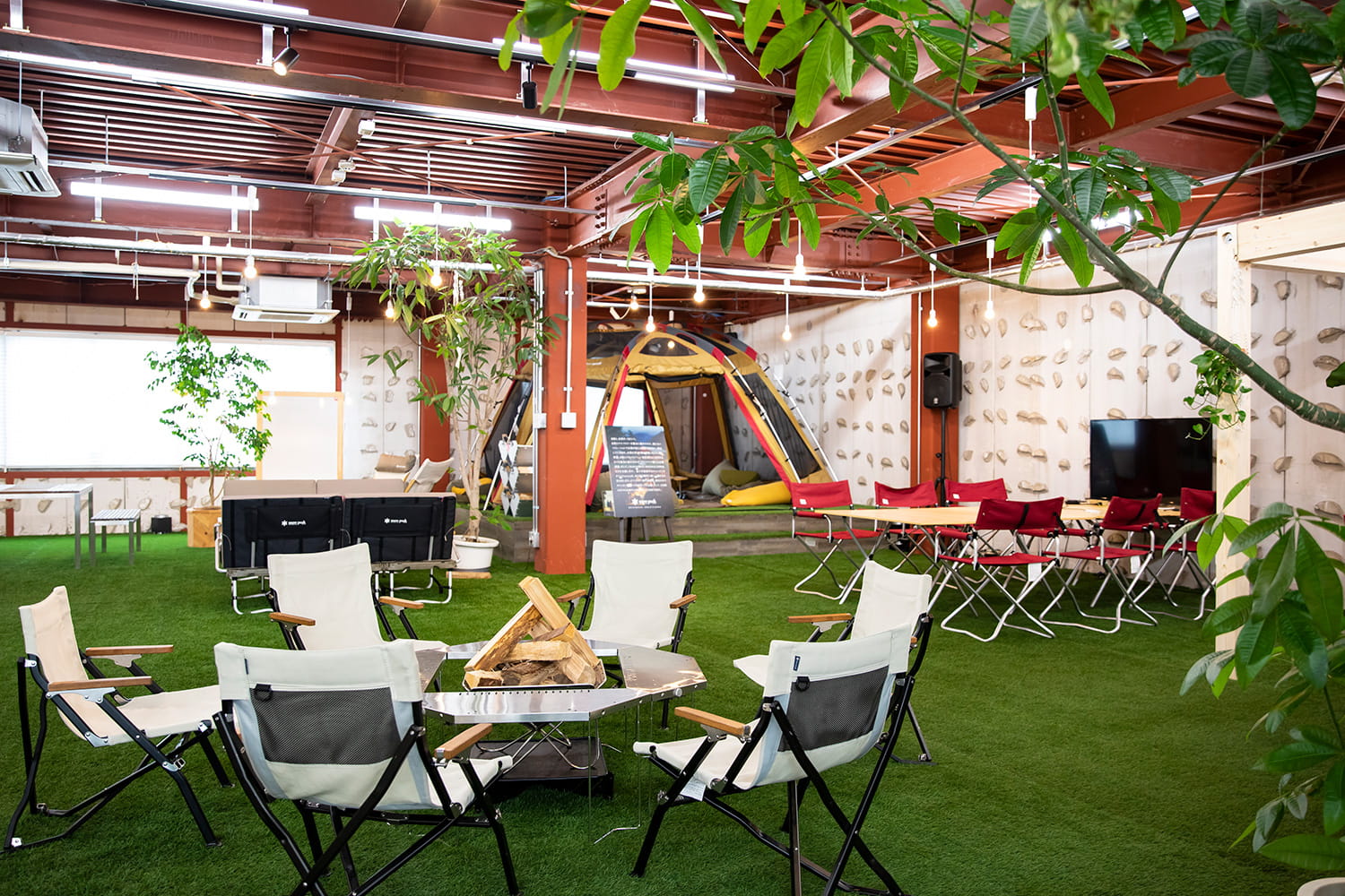 アウトドア空間を使って仕事をするキャンピングオフィスでは、オフィスの中にキャンプギアを取り入れたスペースをつくる屋内版も提案しています。