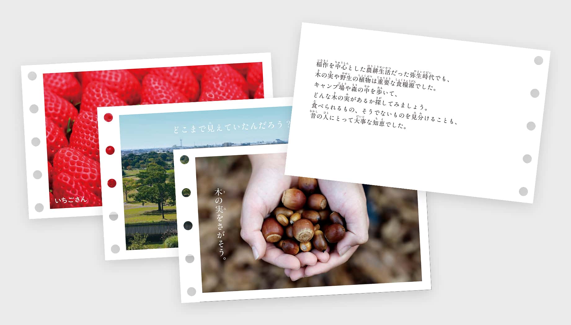 カードを見ながら歴史公園や周辺観光スポットを、遊びながら学べるコンテンツです。佐賀に暮らすデザイナー・矢野貴昭氏と、佐賀県出身のコピーライター・岡優一氏が制作を担当し、土地の空気感や物語を大切にしながら、一枚ずつ丁寧に仕上げています。集めたカードは、一冊の図鑑としてまとめ、思い出とともに持ち帰ることができるサービスも予定しています。