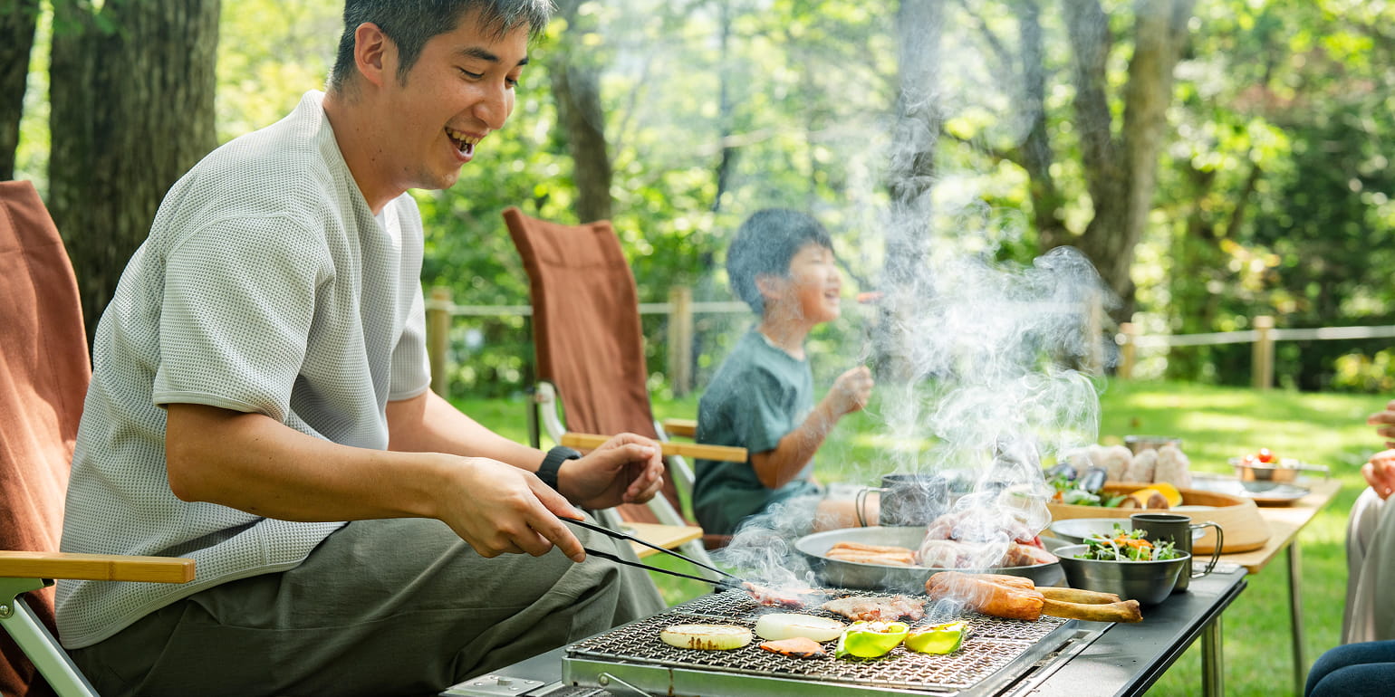 設営が完了したら、あとはゆったりとデイキャンプを楽しみましょう。道中の産直などで地元食材を入手できれば、食事の時間がより豊かに。キャンプフィールドでは、BBQ食材がセットになったレンタルプランのご提供も予定しています。