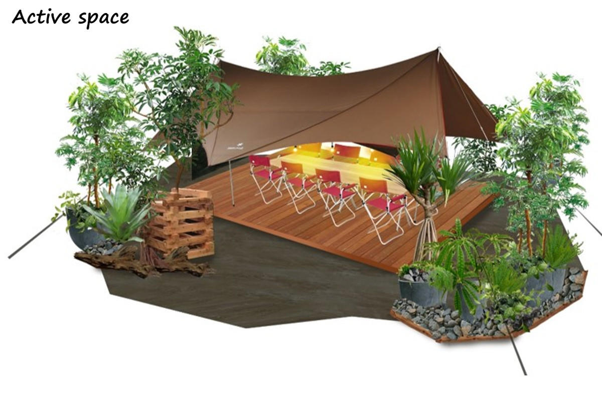 セミオープンタイプの会議スペースです。広めのテントなら会議スペースとして、またはワークショップスペースなど使い方もいろいろ。タープの隙間から緑が感じられ程よい抜け感があります。水の演出も加えることでより自然感がプラスされます。