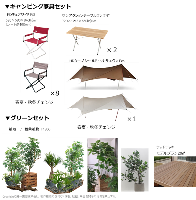 「人材問題をはじめとした企業の課題を根本的かつ本質的に解決する」というミッションを掲げる株式会社スノーピークビジネスソリューションズと第一園芸の環境緑化事業を手掛ける「OASEEDS」が提携することで、これまで無機質、単調になりがちだったオフィス空間を、植物のもつ空気清浄効果やストレス軽減・疲労緩和といった、人への心理的効果とともに、オフィス内で自然を感じられるキャンピングギアなどとの相乗効果を兼ね備えたオフィス空間をご提案していきます。 パッケージレンタルの場合、月額15万円程度からのご提供となります。レンタルサービスとして提供することで、初期費用を抑えて導入しやすくし、また、季節ごとにレンタル商品の内容を変えられるようにすることで、常に利用者が新鮮な気持ちで使用することが可能です。