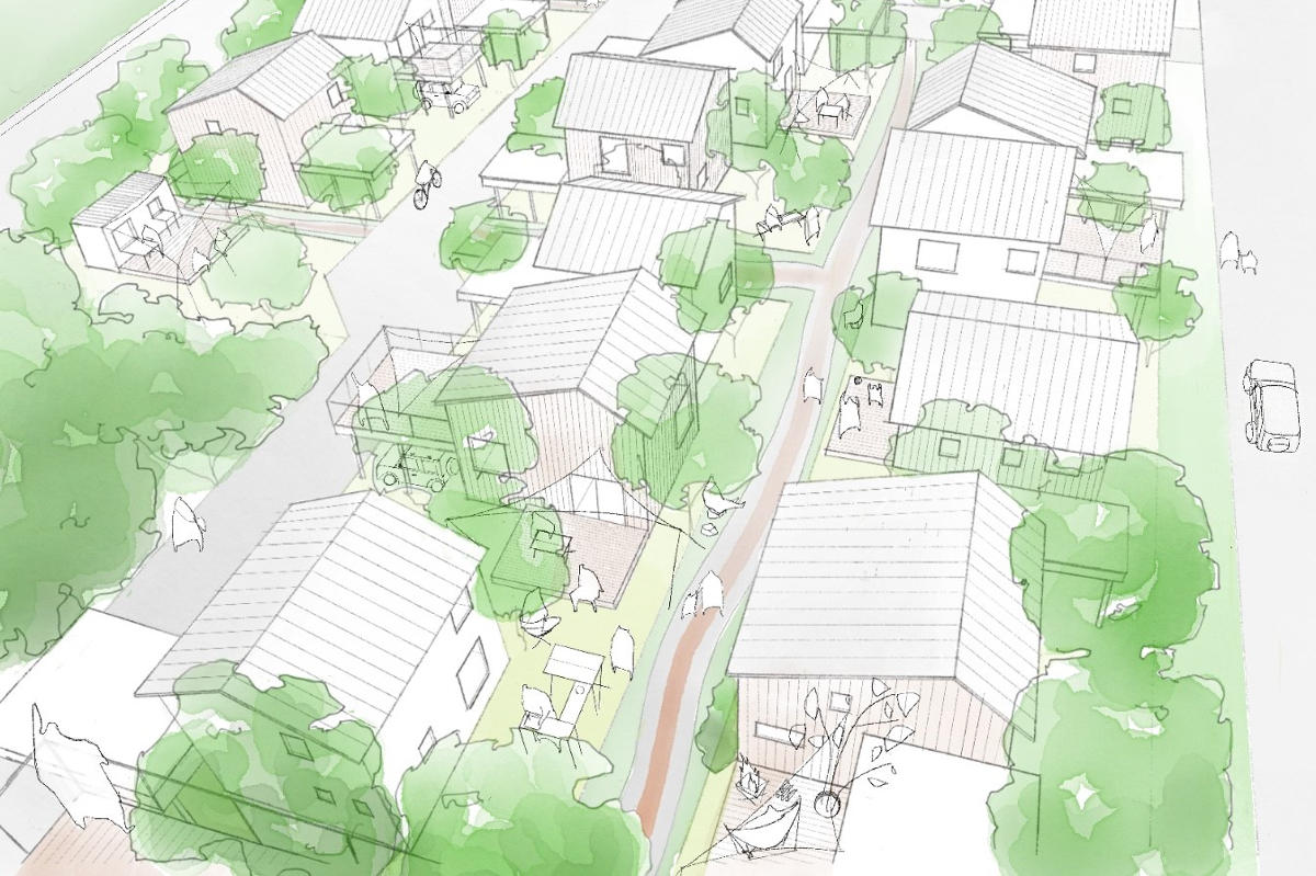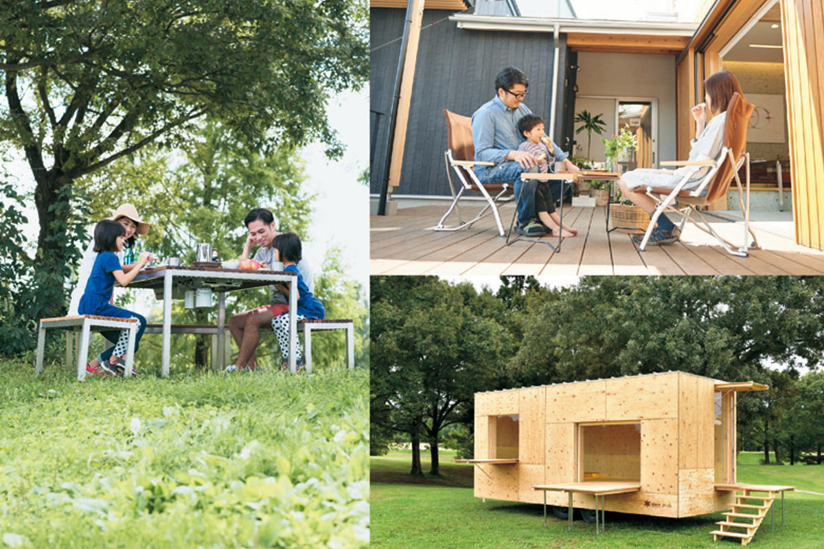 「山形エコタウン前明石」は、従来の宅地区画割りの常識から離れ、小道や植栽による境界に複数の家が集積することで、街全体の豊かな空間を実現します。共用空間の一角には、スノーピークと世界的建築家、隈健吾氏デザインによるモバイルハウス「住箱―JYUBAKO―」を設置。住民同士の憩いの場となるだけでなく、防災備品としても活用できます。