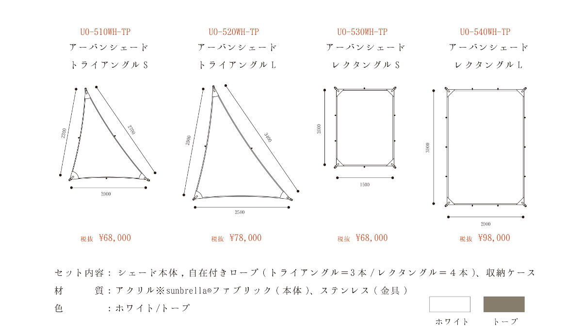 | セット内容 | シェード本体, 自在付きロープ(トライアングル3 本/ レクタングル4本)、収納ケース |