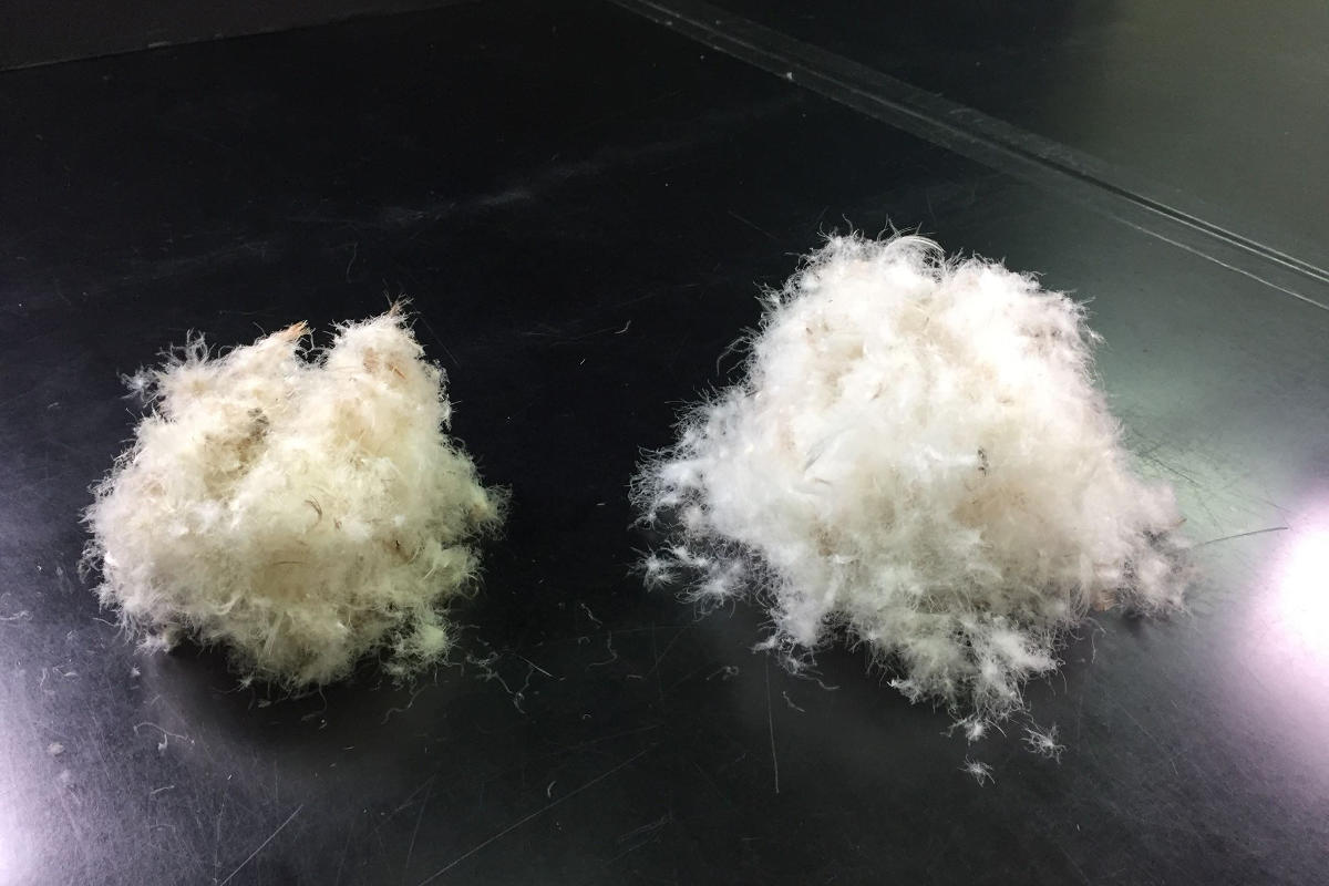 羽毛は洗浄、精製加工することで新毛よりもきれいな「再生羽毛」として生まれ変わります。