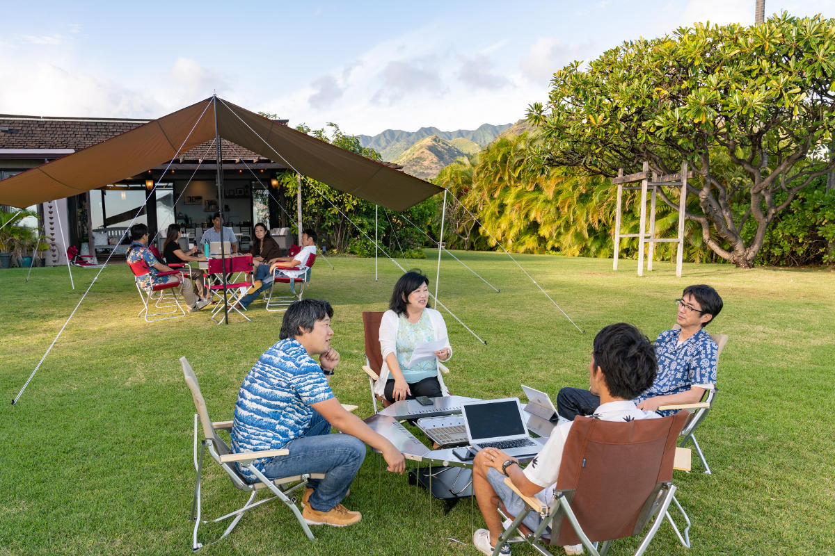 「CAMPING OFFICE HAWAII」は、JTBの現地提携ホテルやレストラン、レジャー施設、邸宅や遊休スペースで、スノーピークのフィールドギアや研修プログラムを活用し"オフサイトミーティング"の機会を提供するもので、"ハワイの大自然の中で休暇を取りながら快適に働く"という新しいワークスタイルを提案するサービスです。チームビルディングワークショップやブレインストーミングなど、様々なワークシーンをサポートします。時間や場所に捉われず日常とは異なる空間で仕事をしていただくことで、生産性や働きがいの向上、イノベーションやアイディアの創出など、企業が抱える課題を解決していきます。