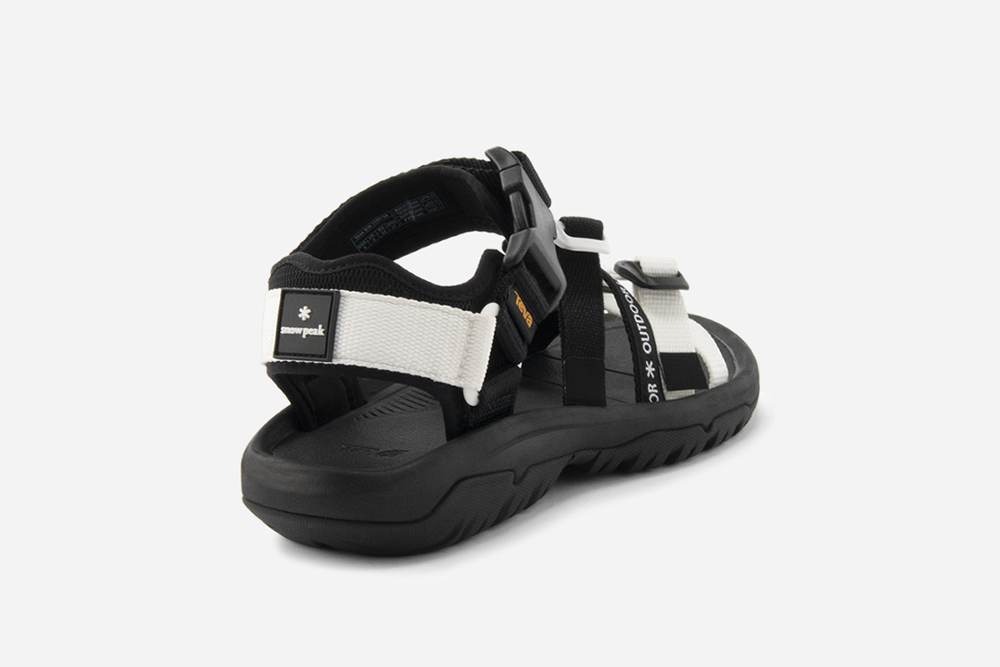 屈強な「HURRICANE」のソールに、90年代に人気を博したクラシックなモデル「ALP」から着想を得たストラップを融合させたノスタルジックなデザイン。Snow Peakの コーポレートカラーであるホワイト・ブラックのバイカラーをストラップに採用。中央のストラップにはSnow Peakのコーポレートメッセージ「OUTDOOR LIFESTYLE CREATOR」の文字をプリントし、ヒールストラップにはシリコンモールドでSnow Peakのロゴを配した特別仕様です。