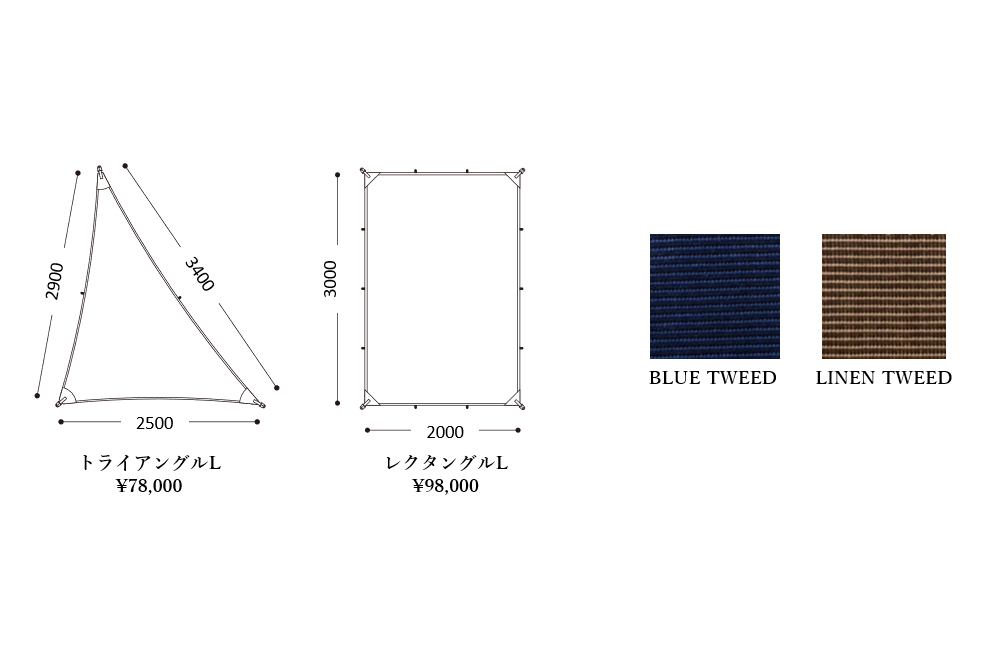 新たな商品は、ツイードのような風合いの素材を使用した「LINEN TWEED」「BLUE TWEED」の2色、形状はトライアングルとレクタの2パターン。「LINEN TWEED」は、自然素材やFDチェアなど赤を基調としたスノーピークのファニチャーにマッチする色合い。さらに「BLUE TWEED」は、ブラックのフレームやグレーのファニチャーを配置したシックなインテリアにマッチする色合いで、様々なトーンに合わせたコーディネートが広がります。