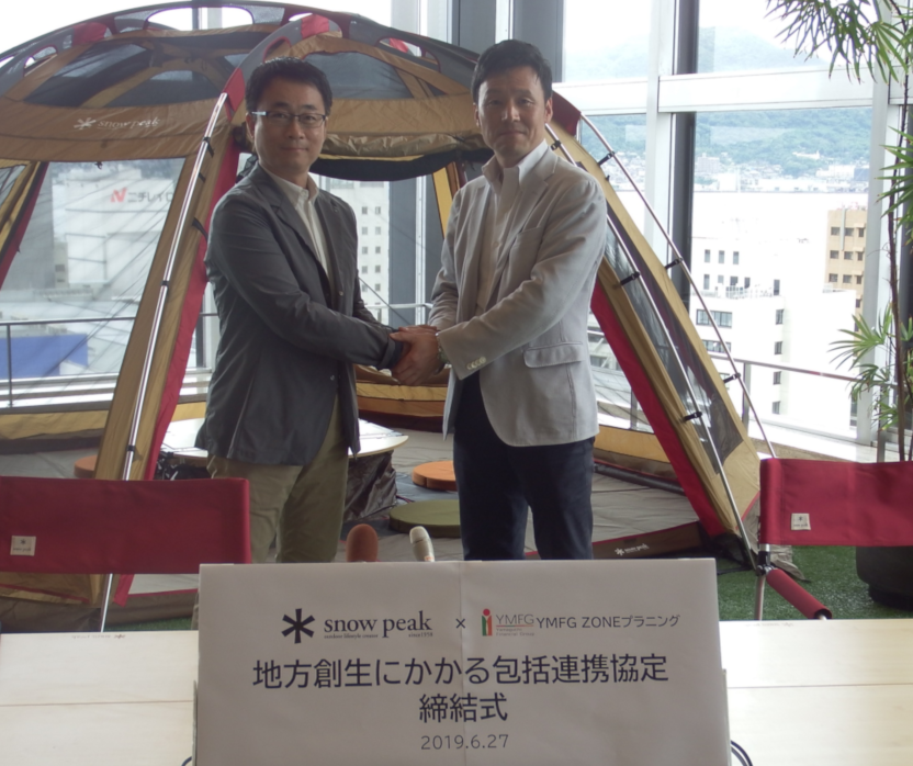 株式会社スノーピーク(代表取締役社長 CEO:山井太、本社:新潟県三条市、証券コード:7816)は、株式会社山口フィナンシャルグループ(代表取締役社長:吉村猛、本社:山口県下関市)の子会社である株式会社 YMFG ZONEプラニング(代表取締役社長:椋梨敬介、本社:山口県下関市)と、アウトドアを活かした地域の魅力向上や新たなオフィス空間の提供による働き方改革の推進を目的に、包括連携協定を締結いたしましたことをお知らせします。