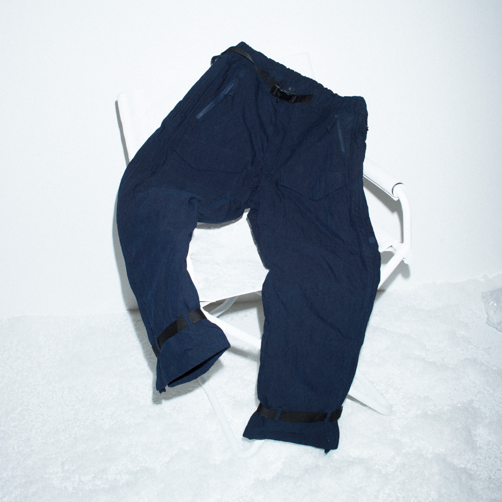 Snow Peak を代表する60/40 クロスと同等の防風、透湿、軽撥水性を持ったコットンナイロンを用いたダウンパンツ。
