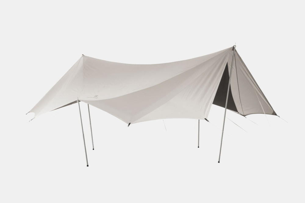 難燃性の高いインナールーフを採用することでタープの下で焚火をすることができる。それによってキャンプや、アウトドアにまつわる状況や行動が確実に変わり、選択肢が増える。その点をまず評価したい。タープ本体は撥水加工がされており、雨を防ぐ本来の機能を果たしながら、幕を二重にするというシンプルな行為で、遮光性や断熱性も従来のタープより向上している。本体は焚火をすることを想定しているため面積が広く、結果として複数の人数で快適に過ごすことができる。