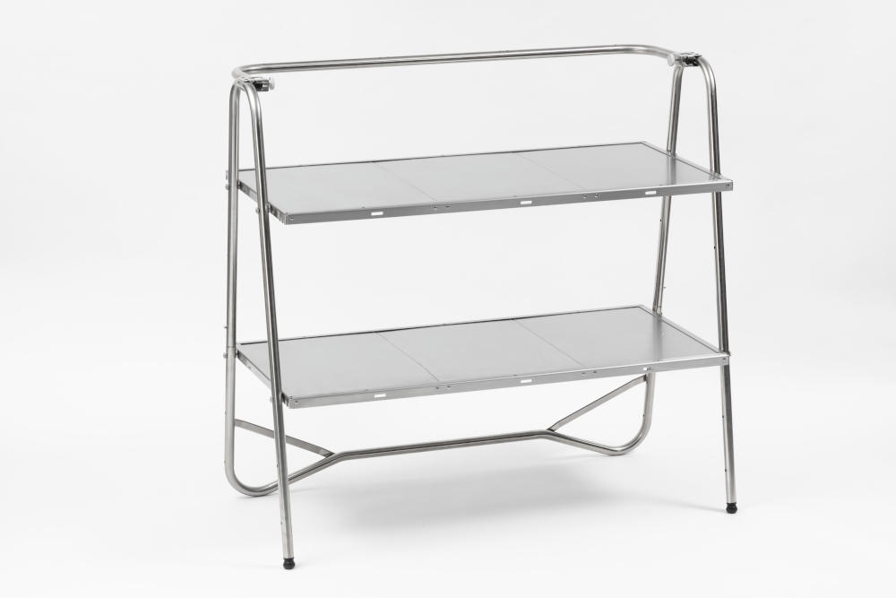 キャンプでの厨房を支えるラック式テーブルは、組み立て式に伴うがたつきの問題が多かった。このテーブルは、支点を減らしたA型の構造で、がたつきを解消している。さらに、ハンガーラックとして、服を掛けるなどTPOに対応した使い方が可能な点が優れている。外観は、シンプルでオーバーデザインがなく好感が持てる。