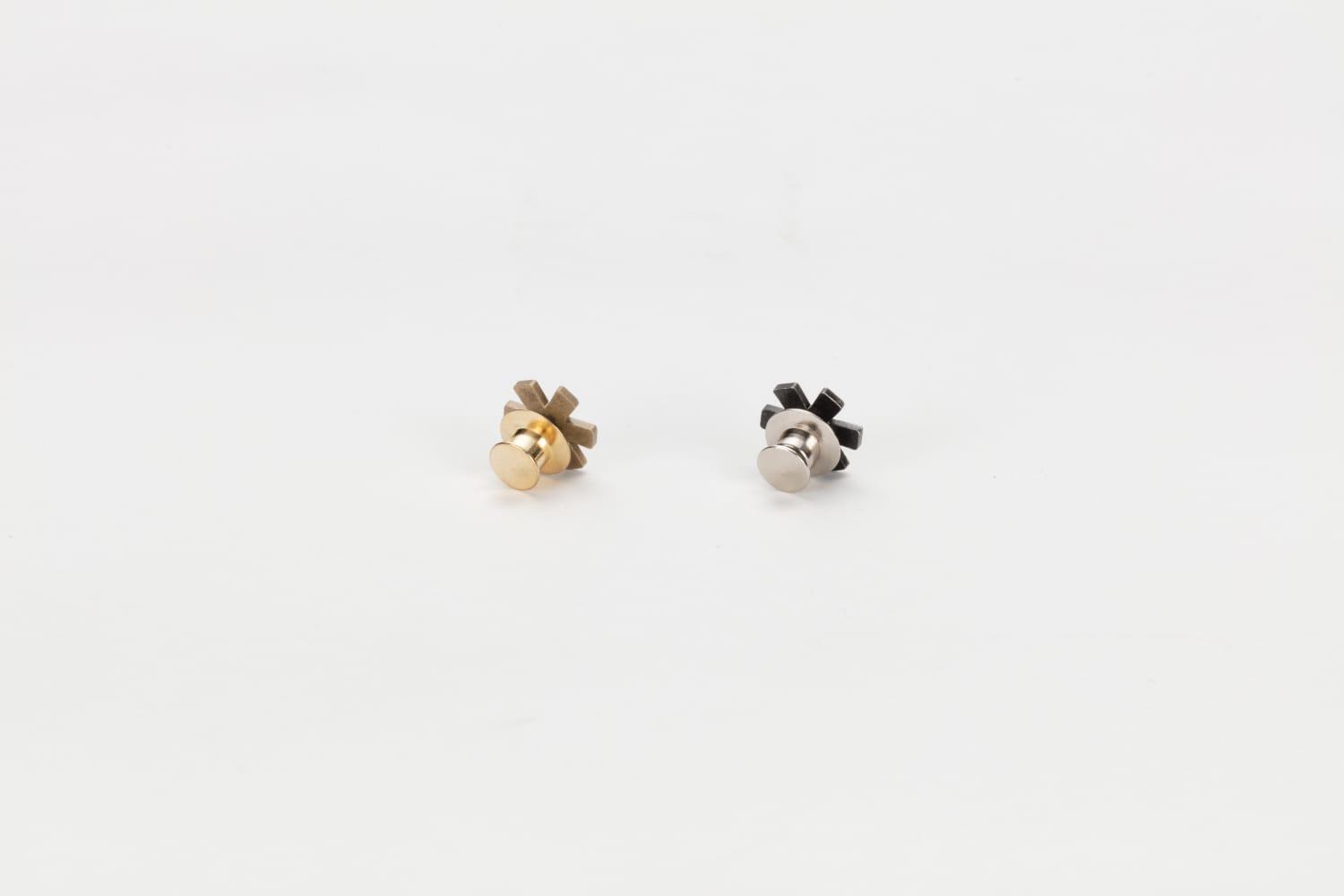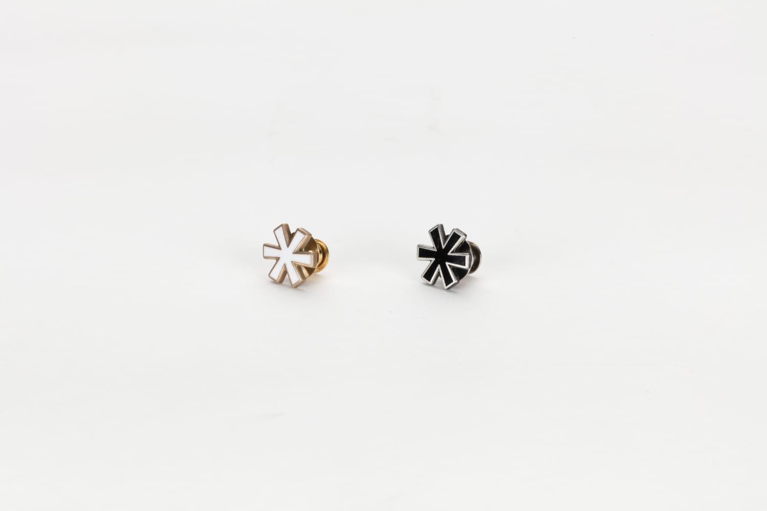 ブラックとシルバー2種類のピンバッチセット。素材は七宝釉薬を用い、自然な風合いのある質感になっております。リュックや帽子などにさりげないアクセントとして使用できる想定のサイズ感・質感です。