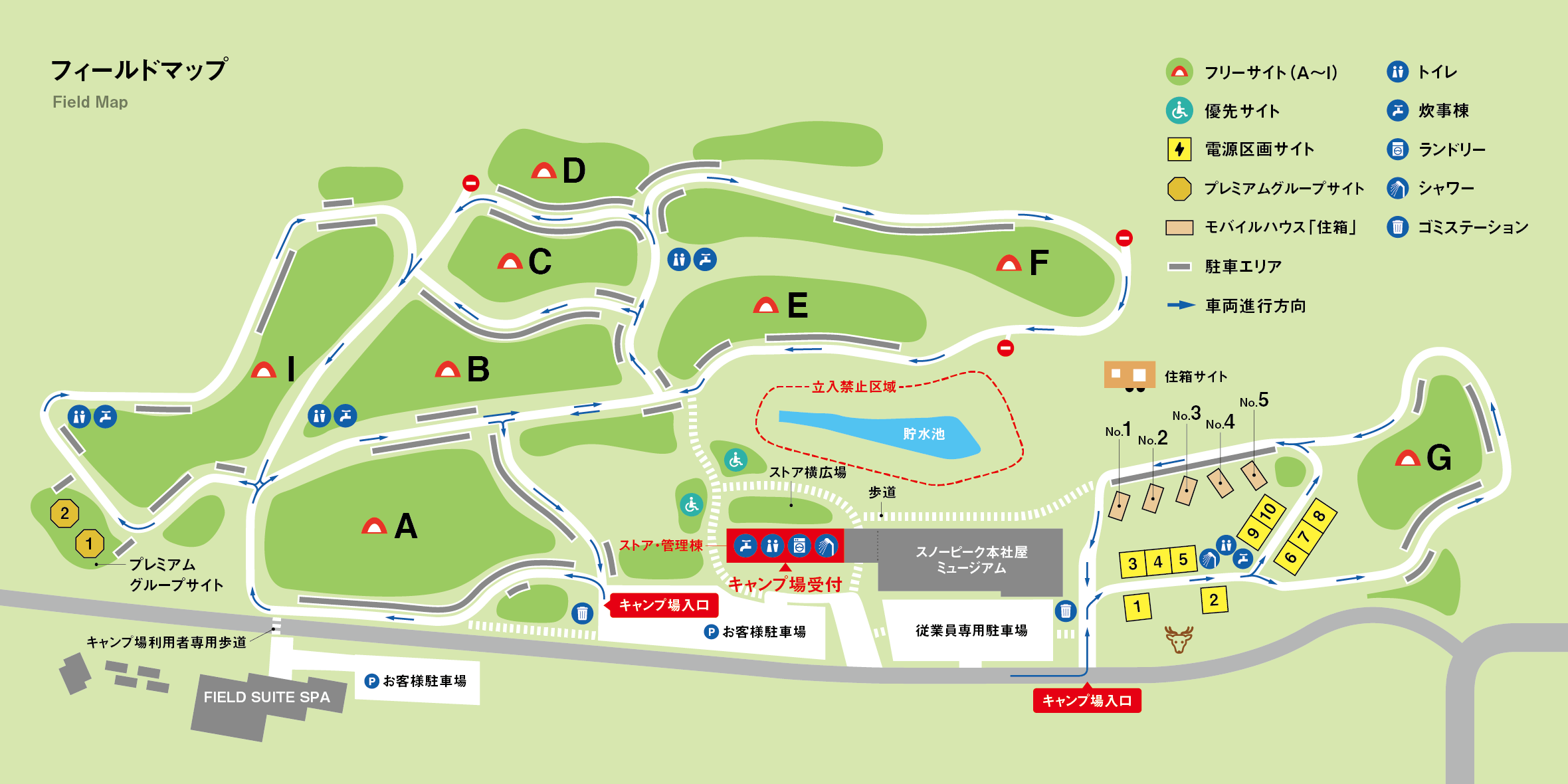 フリーサイトは場所の指定ができますか? サイトの指定、場所の指定(ご予約)はできません。先着順にお好きな場所をお選び頂き、ご設営いただきます。御身体の不自由等、やむを得ない理由がございましたらお電話にてご相談ください。 |