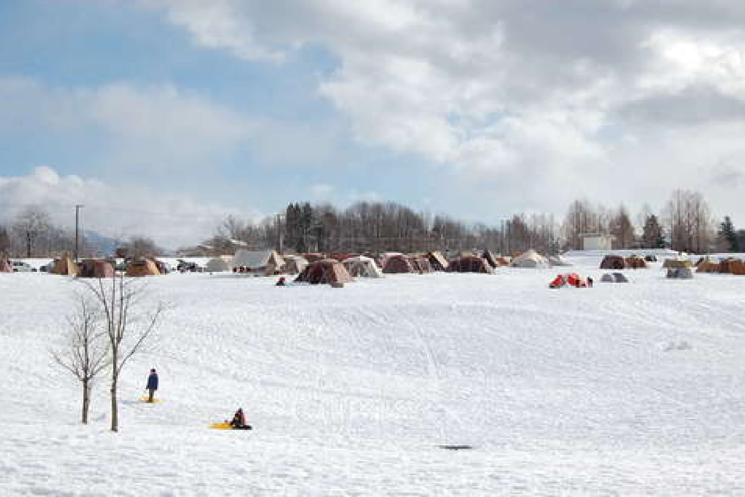雪で覆われた広大なフィールドをスノーシュートレッキング。レンタル無料のソリ遊びも大人気。スタッフもいるため雪中キャンプ初心者も安心です。