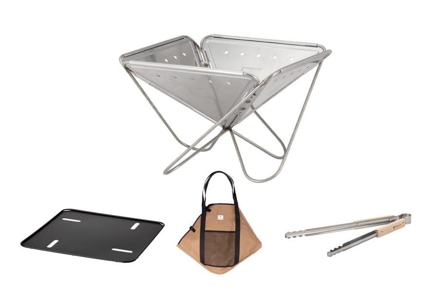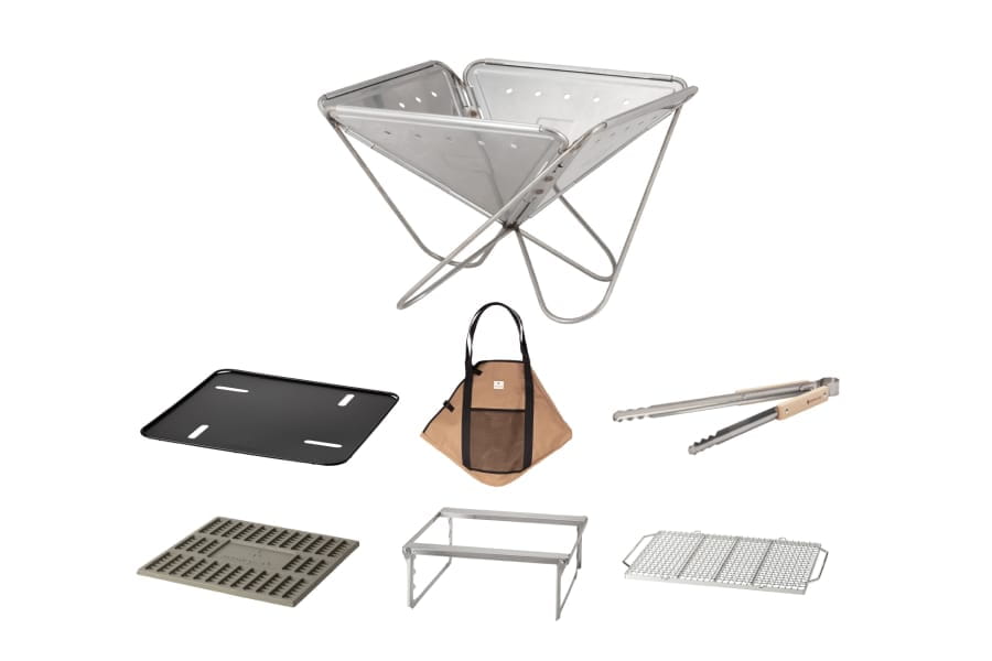 【12|焚火台BBQセット】内容物/(1)焚火台L(2)焚火台ベースプレートL(3)焚火台収納ケースL(4)火ばさみ(5)炭床Pro L(6)焚火台グリルブリッジL(7)焼アミPro.L※その他ライター、着火剤など