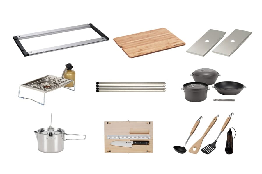 【14|IGTキッチンセット】内容物/(1)IGTフレームロング(2)ウッドテーブルW竹(3)リッドトレーハーフユニット×2[ステンレストレー1ユニット×1](4)フラットバーナー[プレートバーナー](5)830脚セット×2(6)パンクッカー(7)ケトルNo1(8)マナイタセットL(9)キッチンツールセット ※その他
