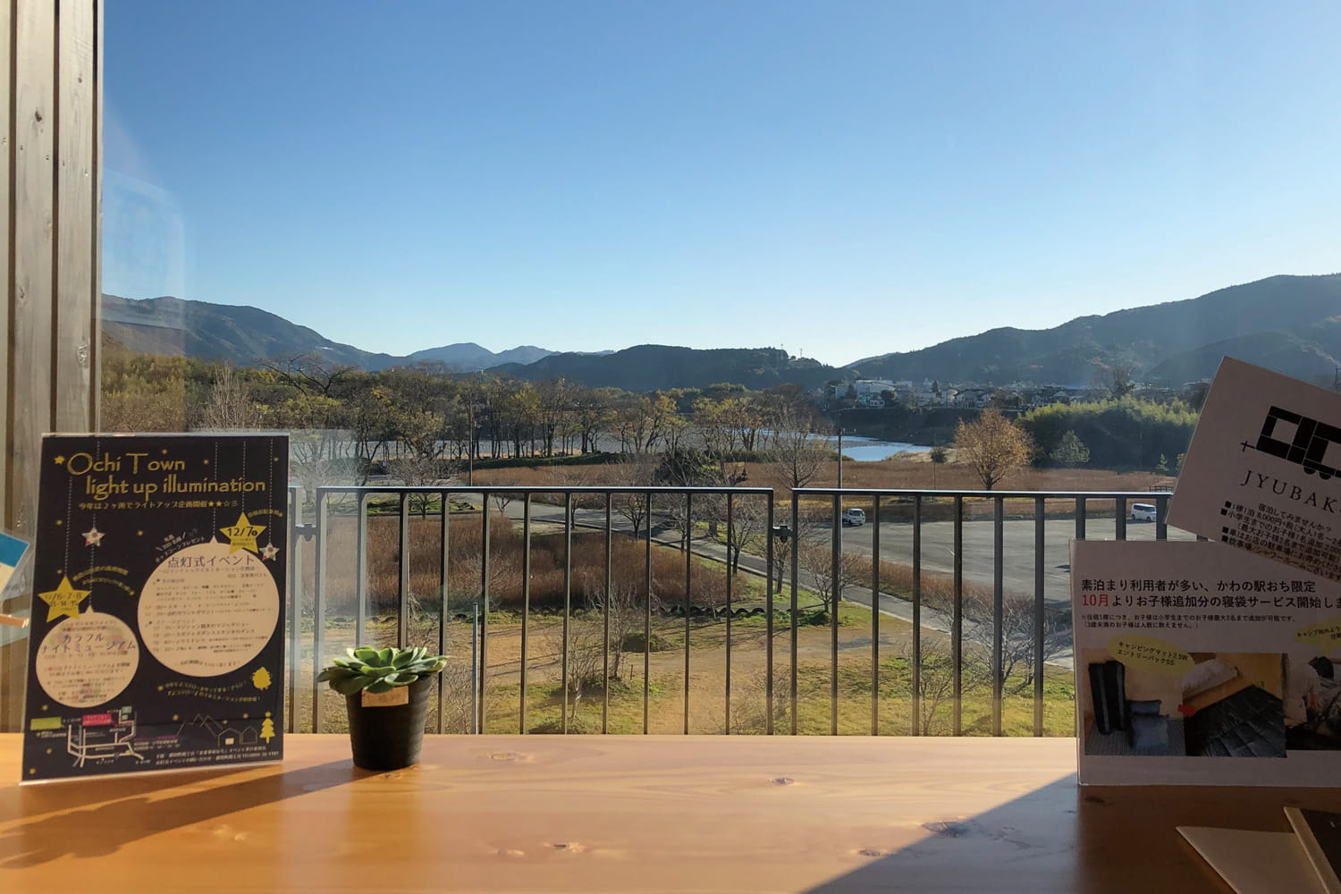 高知市内から町中心地を抜けた国道沿いに位置しており、眼下に広がる宮の前公園では、秋になると「コスモスまつり」が開催され、多くの観光客で賑わいます。冬の降雪は少なく、乾いた夏の暑さは温暖な気候の地域ならでは。山、川、町を遠望できるテラス席で、ゆったりとした時間をお過ごしください。