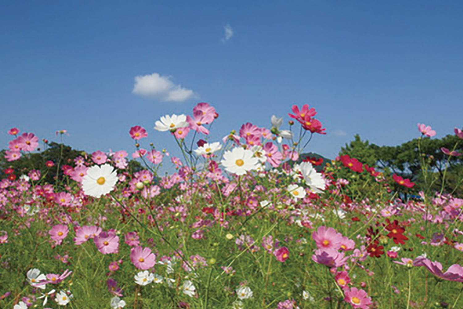 10月のコスモスまつりでは多くの人で賑わいます。3月下旬には桜が咲き誇り、7月下旬には花火大会も。広くてのんびりできる町民憩いの公園です。