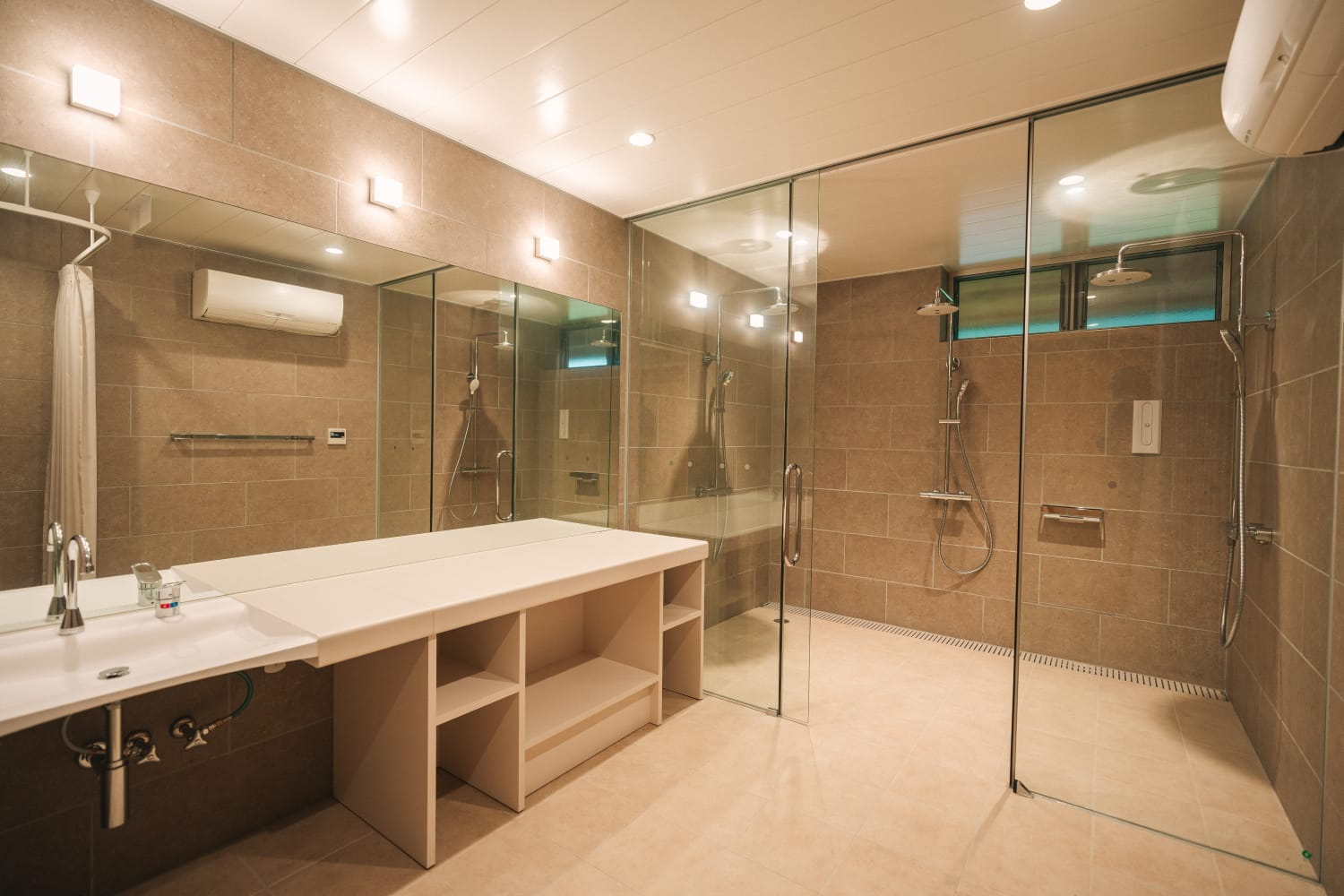 24時間どなたでもご利用いただけるシャワーを完備。個室に加え、2~4人をカバー出来る大型ルームをご用意。シャンプー等は各自ご用意ください。
