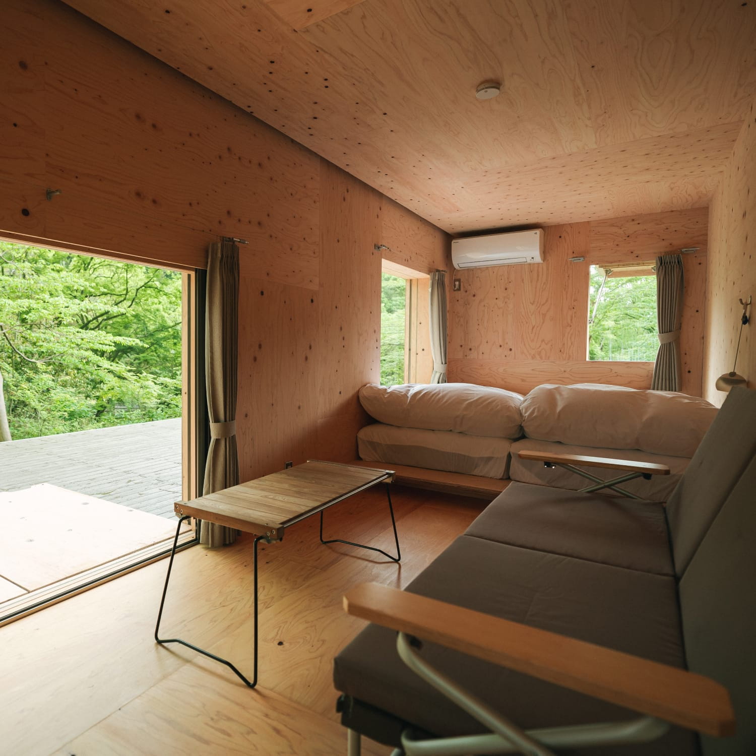 1泊2日のキャンプ体験を、スノーピーク製のトレーラーハウスでお楽しみいただけるプランです。快適な室内からは、大きな窓を通して目の前に広がる景観を楽しめます。もちろんキャンプ道具はすべてお貸しだしいたします。