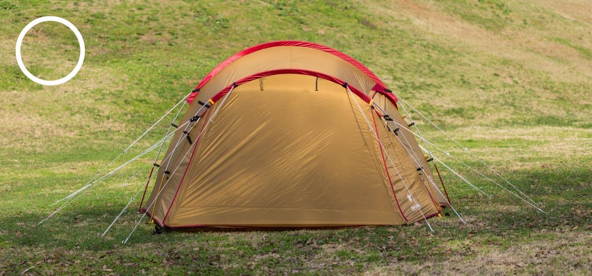 とっても設営がしやすいのですが、ロープをしっかりとペグダウンすることで本来の強度を発揮します。