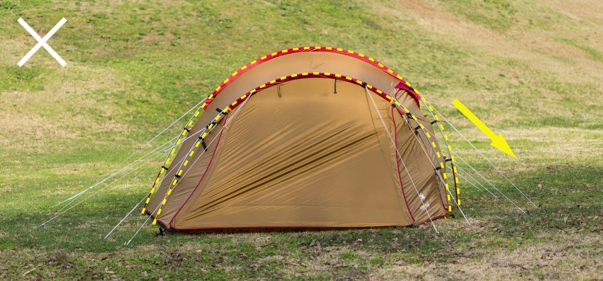 ロープを片方に引きすぎている場合はテント生地に極端なシワが出ます。