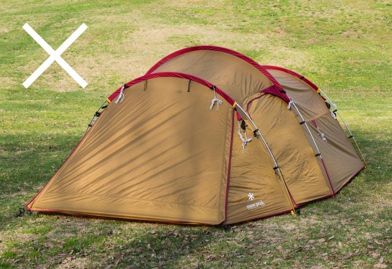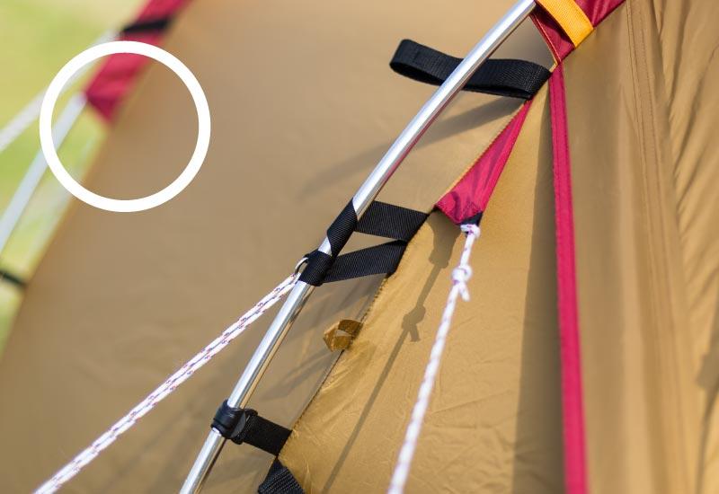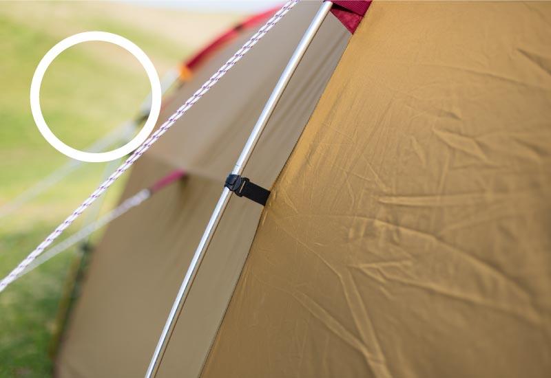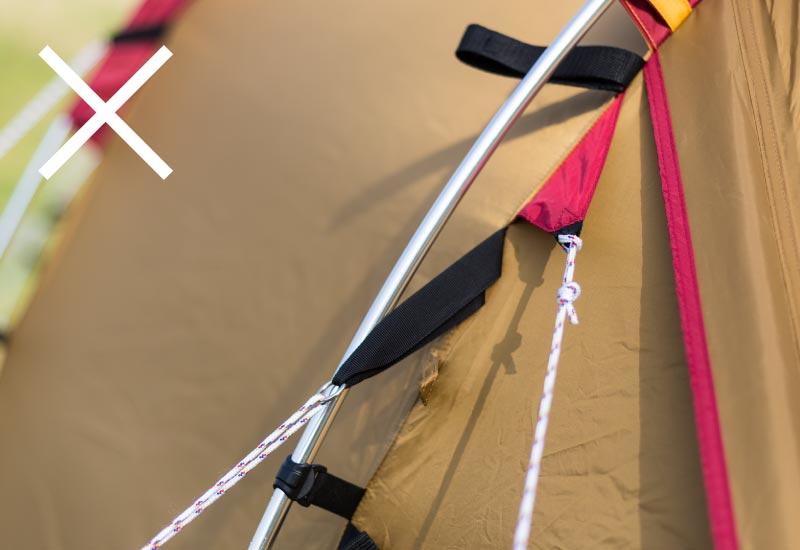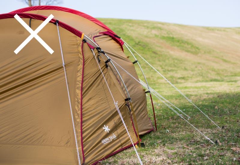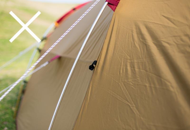 ロープを正しく張っていないと、フレームの破損や風でテントごと飛んでしまったり、生地が破れてしまう恐れもあり