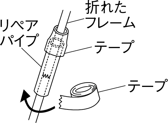応急処置として速やかに付属のリペアパイプや添え木をあて、ビニールテープなどで固定するか、撤収してください。
