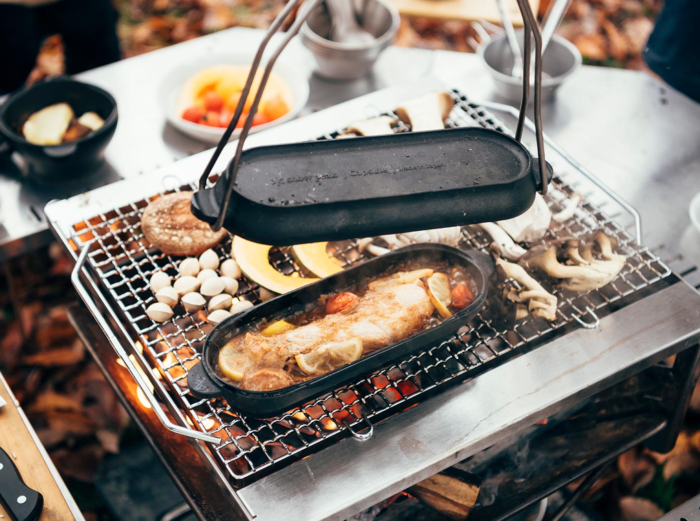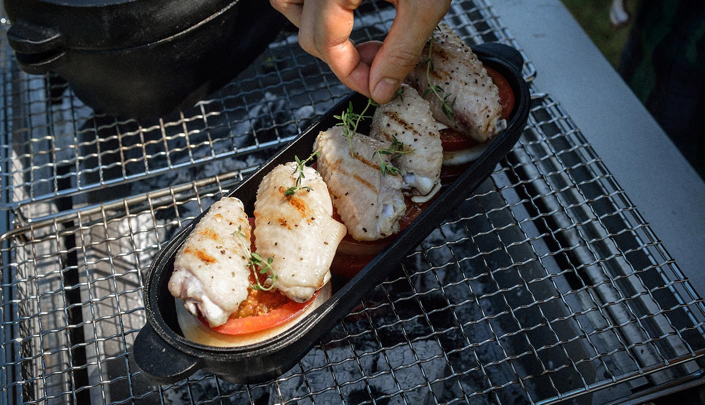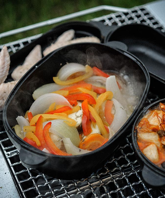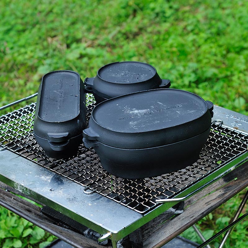 発売以来、コロダッチポット、カプセル、オーバル、どれも大きなデザインの変更はせず、細かな仕様を修正しながら進化を続けてきた。シンプルな調理方法と味付けで素材本来の味を引き出し、野菜はふっくらやわらかくなる。フタの裏面には3mm厚のリブ加工が施されているため、肉や魚の余分な油を落とし、きれいな焼き目をつけることもできる。さらに調理後、そのまま可愛らしく食卓に並べられる。家での食事にも、焚火料理にも適応したコロダッチは、多くのキャンパーから支持されて続けている。