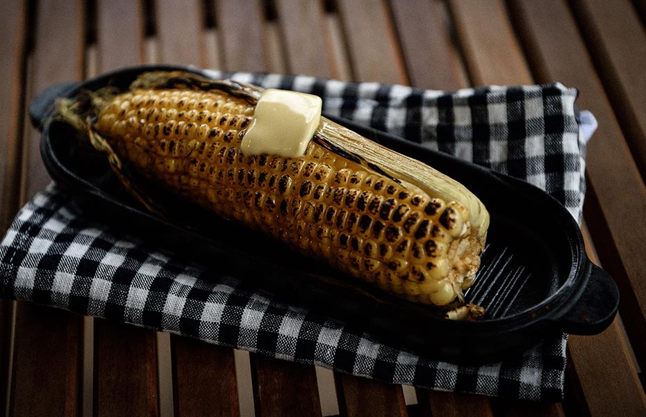 1.とうもろこしをカプセルにいれ、中弱火でとうもろこしに火が通るまで熱する。/2.火が通ったら、カプセルの蓋を使い醤油、ミリン、酒、砂糖を煮詰める。/3.(2)をとうもろこしにかけてバーナーであぶり、焼き目をつける。/4.バターをのせて完成。