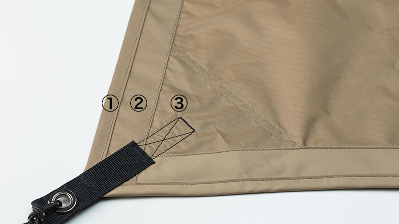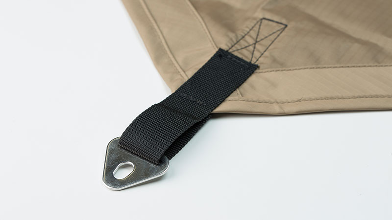 ウェイビングテープの先に三角金具を接続。テープの先にジョイントするので、大型三角力布とともに衝撃を緩和し、本体生地を守ります。ハトメではなくフレキシブルに動くようにしています。