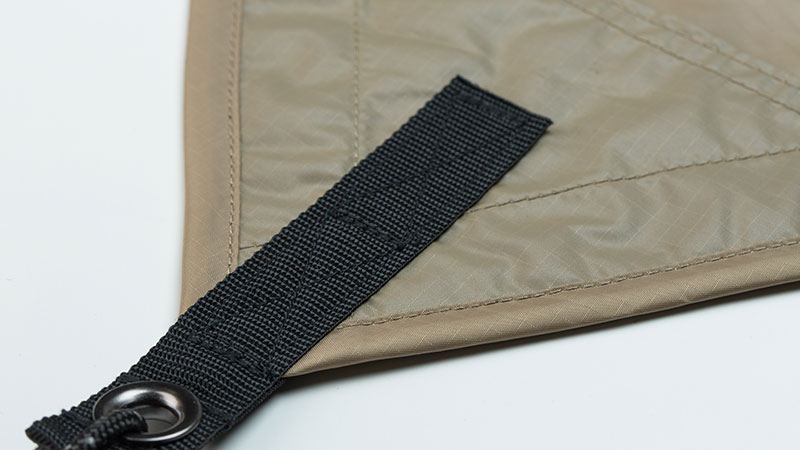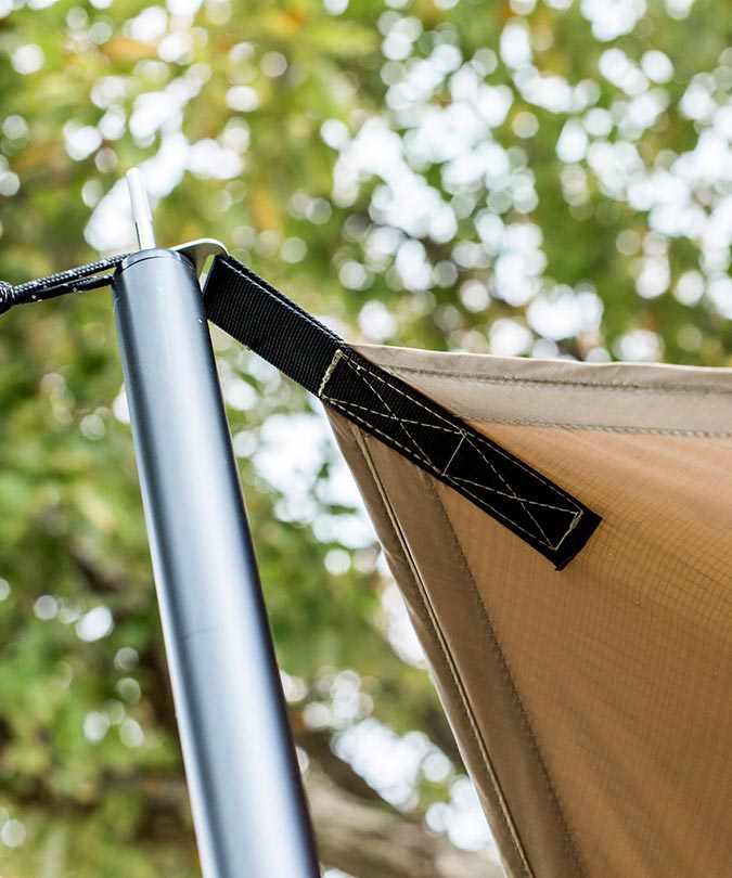 タープは上下方向からの大きな風の力を受けます。その衝撃をウエイビングテープが吸収し、ポールとロープに分散させる設計。