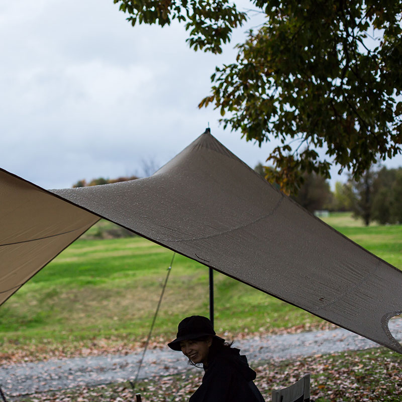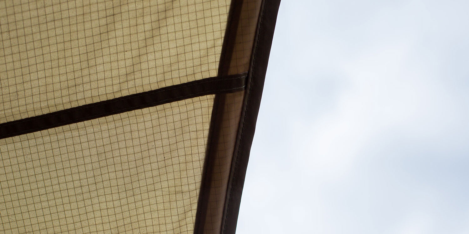 当時あり得なかった210Dという生地厚のヘビータープをリリースしてから、20年の間にタープに使用される生地も年々進化を遂げてきた。210Dのように、生地厚を高くすればそれだけ重量が増していく。私たちは、技術の進歩によって生まれた新素材をPro.airラインに採用。75Dという薄い生地の採用ではあったが、ピッチの細かいリップストップを織り込む事により、高強度でありながら軽量化を実現。生地が薄くなる事による耐水圧の低下は、表面コーティングにシリコンを使用する事で撥水性を格段にアップさせ、耐水圧を補うよう設計された。75Dという軽量コンパクトな生地を選択できたのは、新素材開発の進歩によるもの。タープ以外でも、テントにはテントの、シェルターにはシェルターの各々に必要なスペックがあり、私たちはその製品に、より適切な生地素材を探し求め、選定し採用しつづけている。