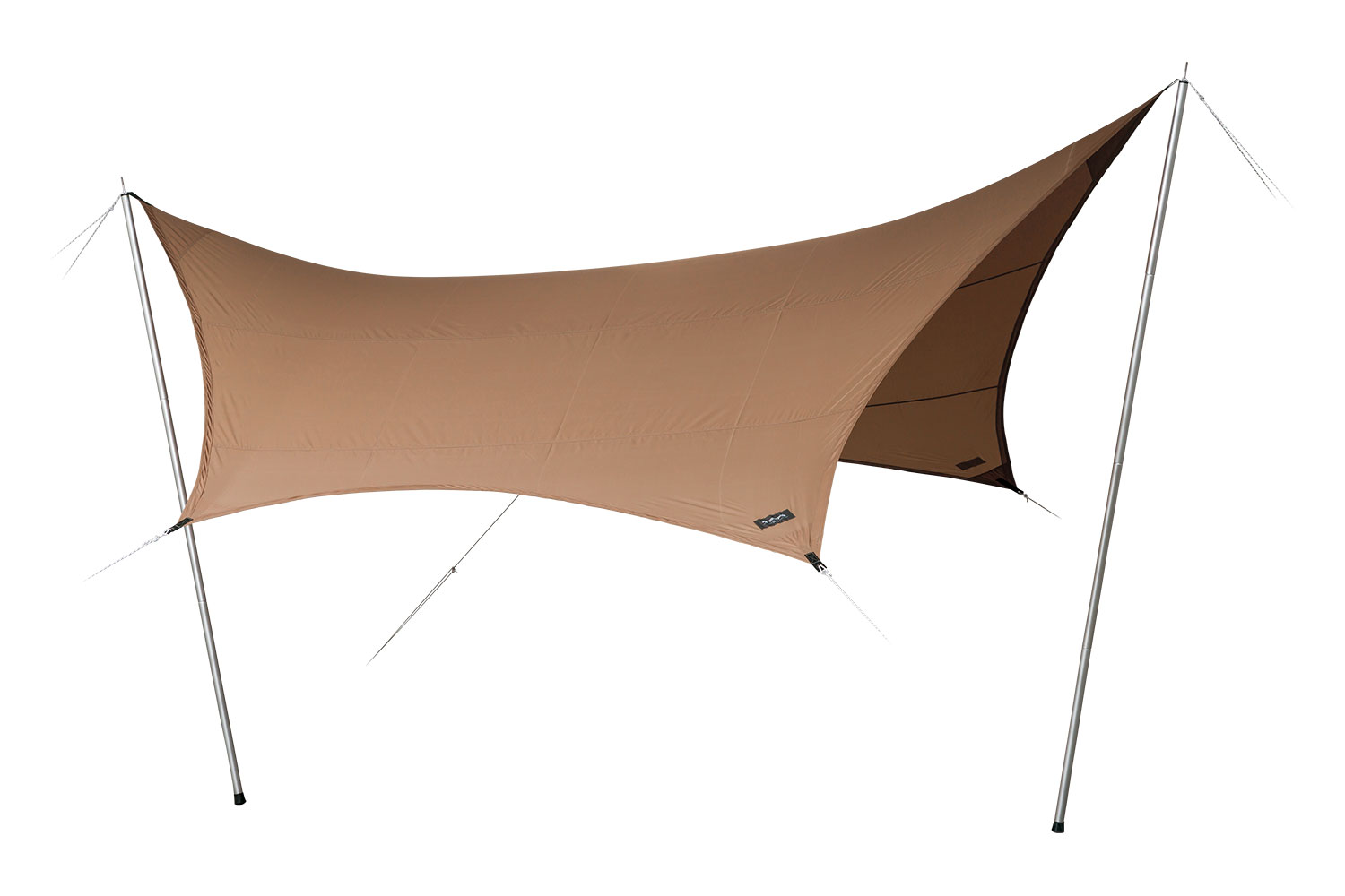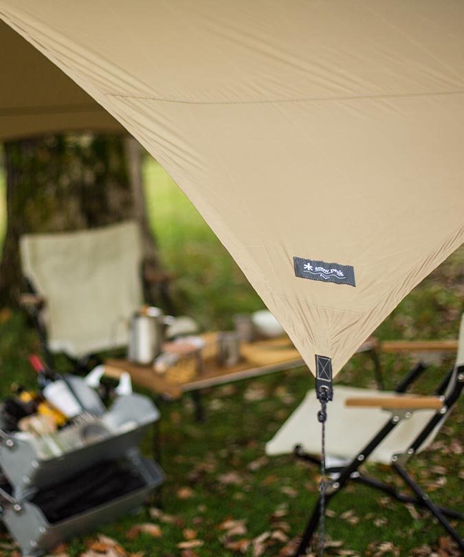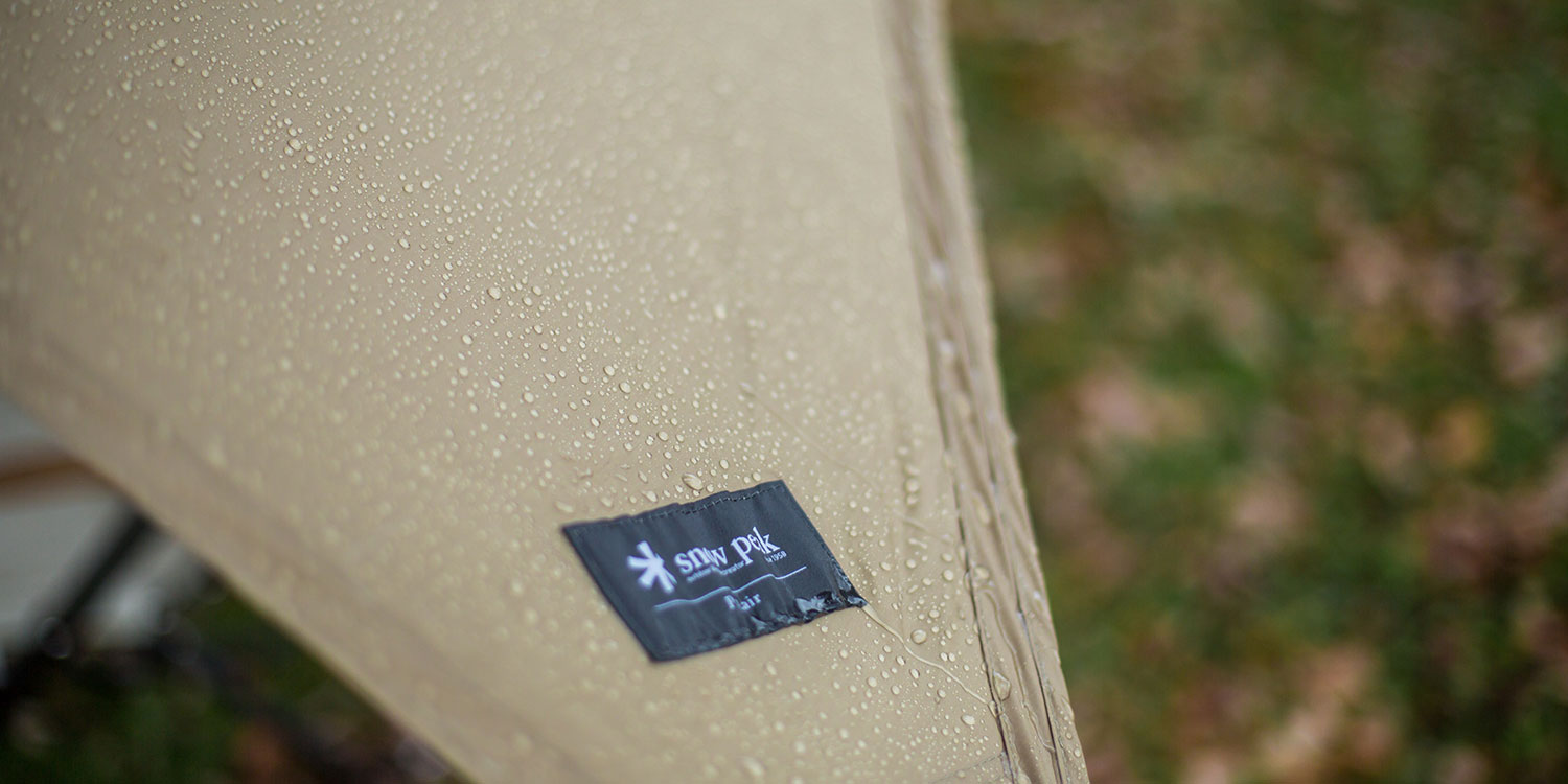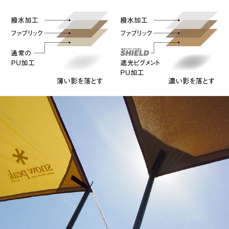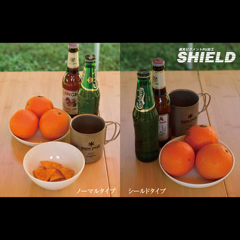 シールド加工が施されていますので、真夏の日差しを軽減し、天幕下のリビング環境を快適にしてくれます。シールド加工のある幕体を使用した事のある方なら、その効果を実感していただいていると思いますが、加工している物と、していない物を比較すると、快適性の違いは歴然です。 私たちも以前は、シールド加工を施していないタープを販売していましたが、その当時、雨を凌げても日差しをブロックできないタープに不満を感じ、暑さを軽減できるタープの開発に着手しはじめました。 しかし、単純そうに思える加工が、想像以上に難しく、ファーストサンプルは見事にムラだらけのタープが出来上がりました。その後、幾度もトライを繰り返し、ようやく安定した製造が可能になったのは、着手から5年後の事でした。 決してあきらめず、こだわり抜いて完成したシールド加工。その効果をスノーピークの幕体で是非実感してください。
