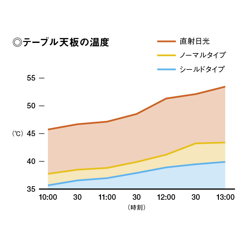 気温35〜45度という暑い中で、"シールド"の温度を測定してみました。ノーマルとシールドそれぞれのタープの下にセットしたテーブルと、直射日光下に置いたテーブルという計3か所で測定してみました。その結果、シールド加工を施したタープはノーマルより2〜4度低い温度差がでました。(※測定の数値は検証環境によって変わります)
