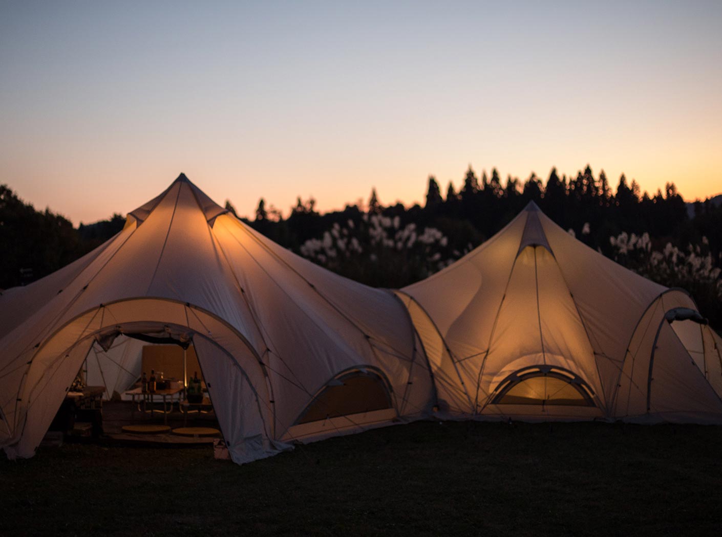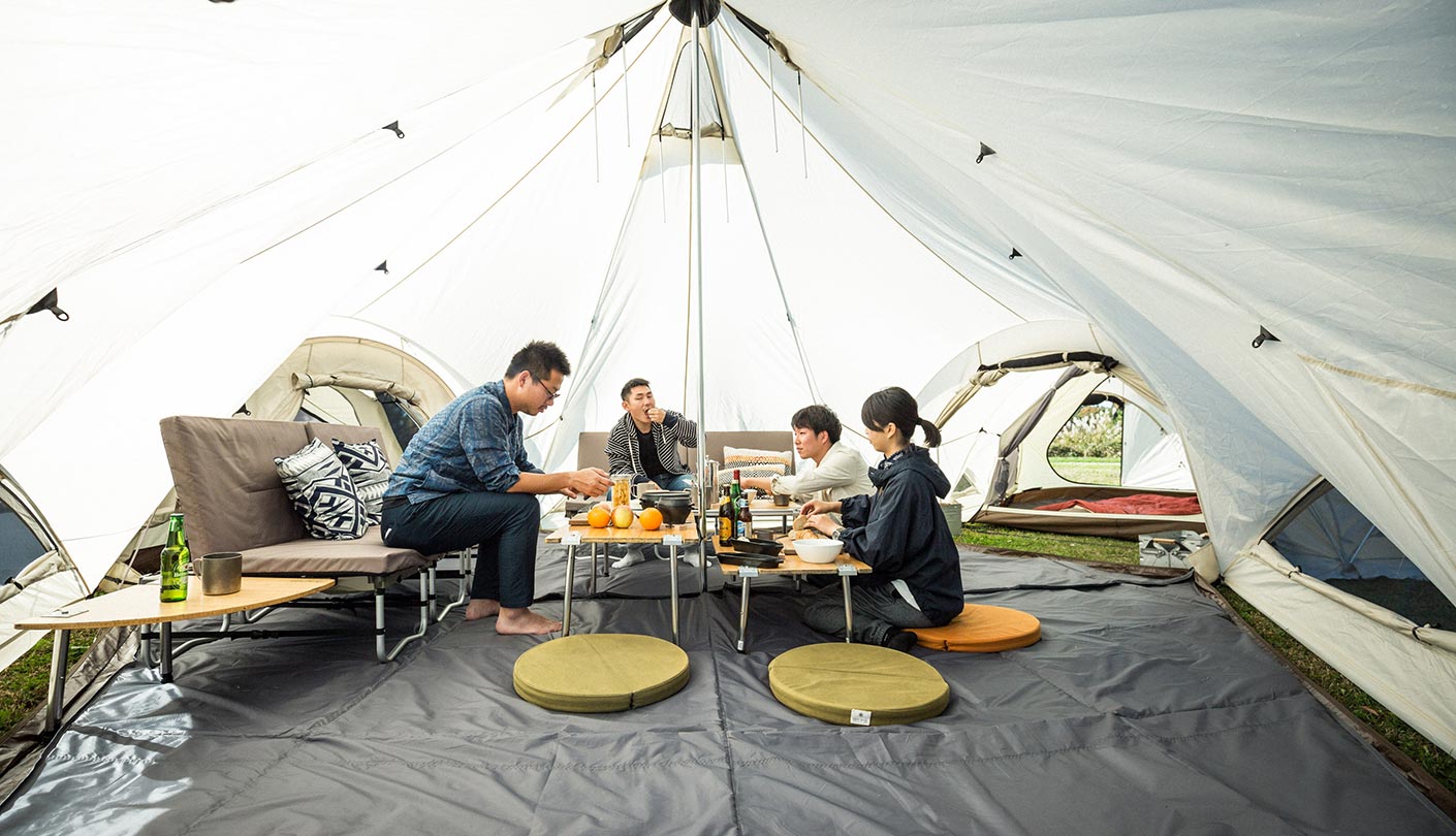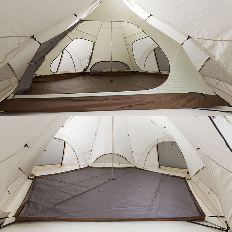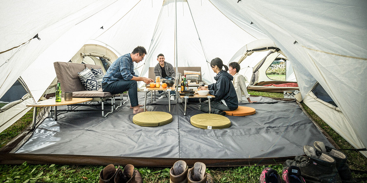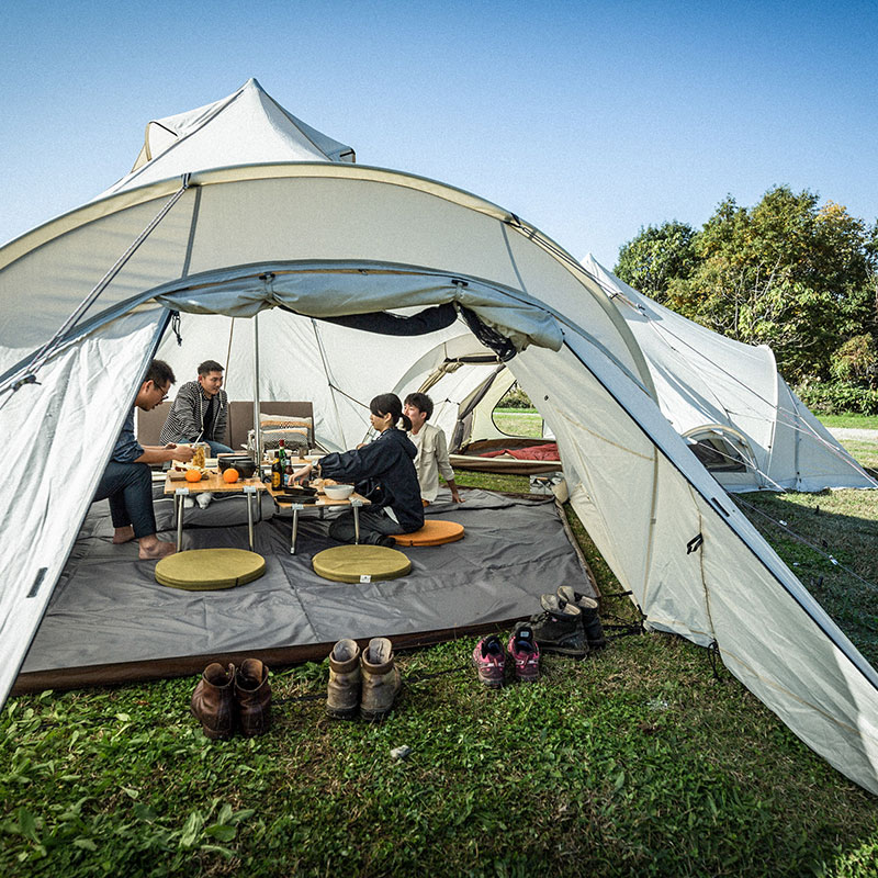 気候などにあわせて、インナーテントを吊るしたり、夏場はリビングシートとフロアマット(マットはインナールームに兼用可能)のみを使用したグランドスタイルへの変更も可能でサークル上での着座はコミュニケーションを活性化させる点においても優れており、目線が低くなるためさらに広さを感じていただけます。グランドシートを取り外せば、大型のシェルターとしても使用でき、チェアやテーブルのセッティングも可能となります。